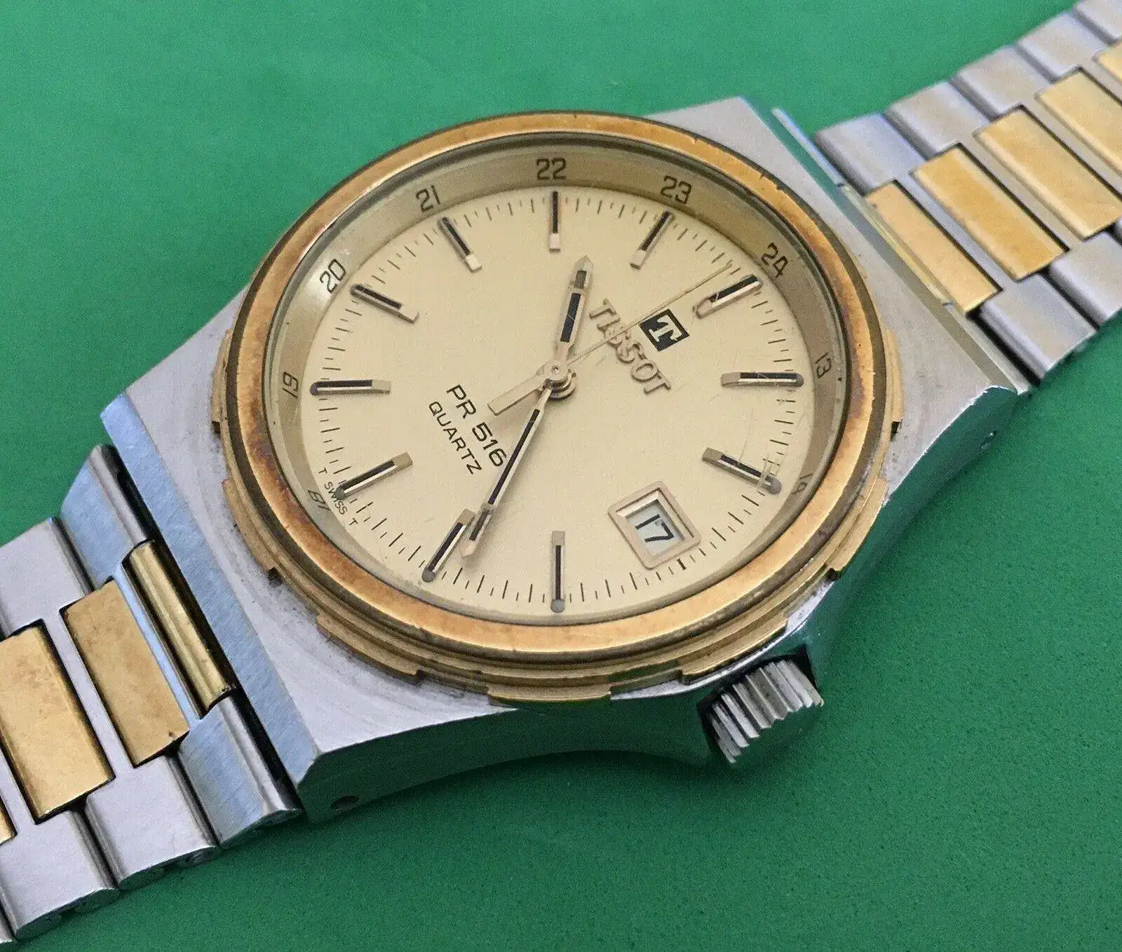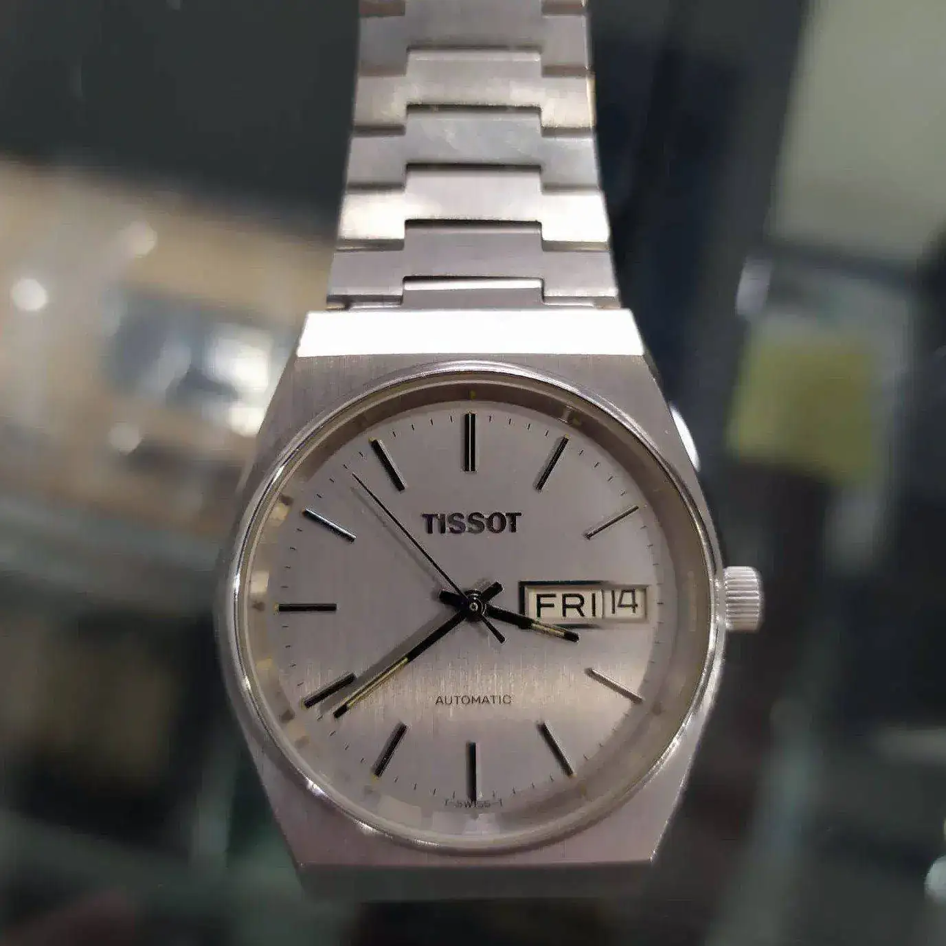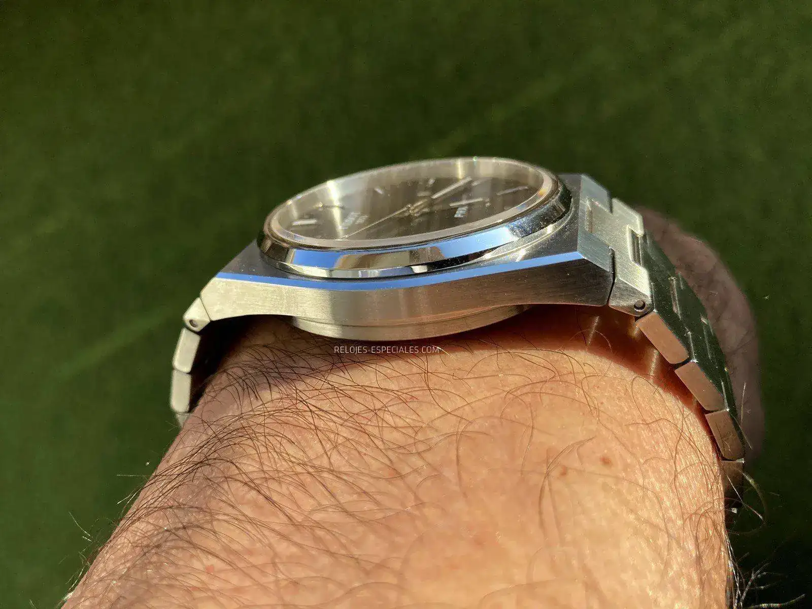 Ese bisel está pulido a espejo, y es prácticamente lo único que lo está en todo el reloj si exceptuamos los cantos, tanto de la caja como de los eslabones que conforman el brazalete. Incluso la corona (que no es roscada, 100 metros de resistencia al agua) es matizada, con la T en relieve pulida. Me da la impresión de que el grado de ese matizado no es fruto del azar, más bien parece meticulosamente elegido para sacar lo mejor de cada opción: evitar las famosas (e "inevitables") micro-rayas sin quitarle brillo del todo. Un cepillado vertical paralelo a las doce/seis que se extiende por el conjunto caja/brazalete.