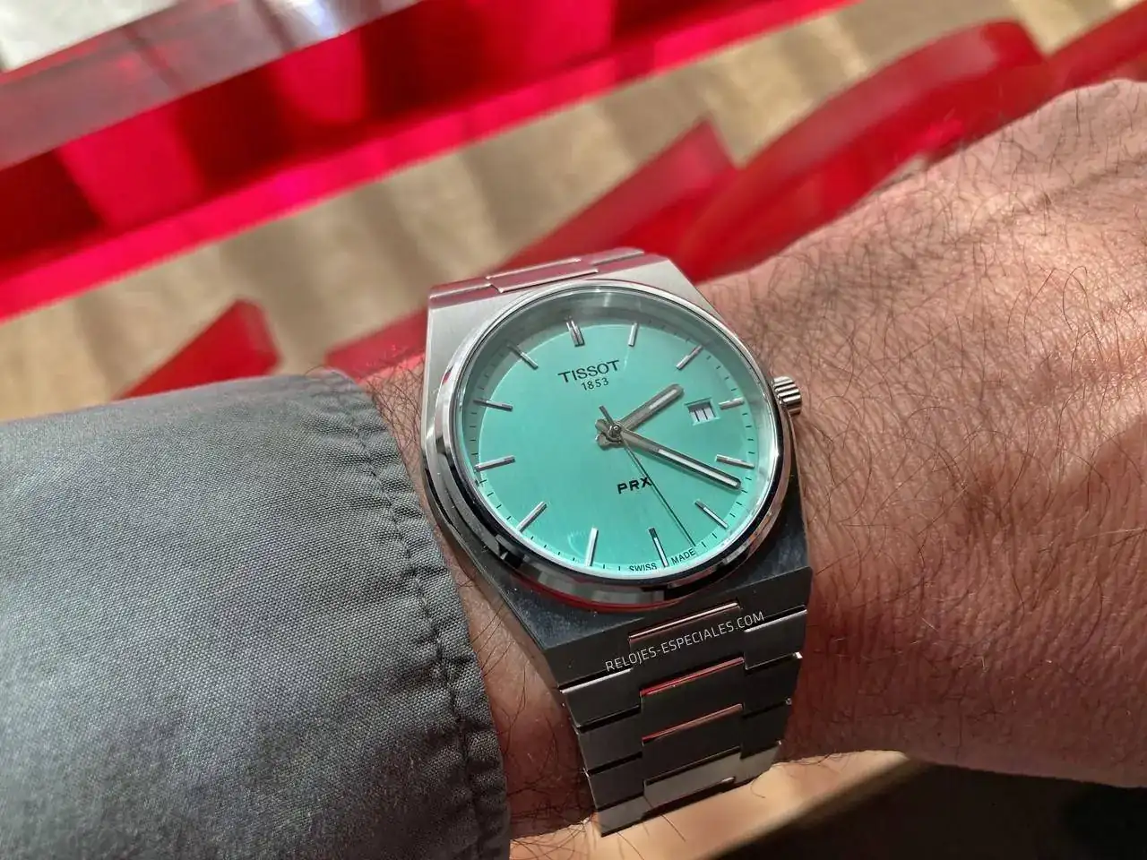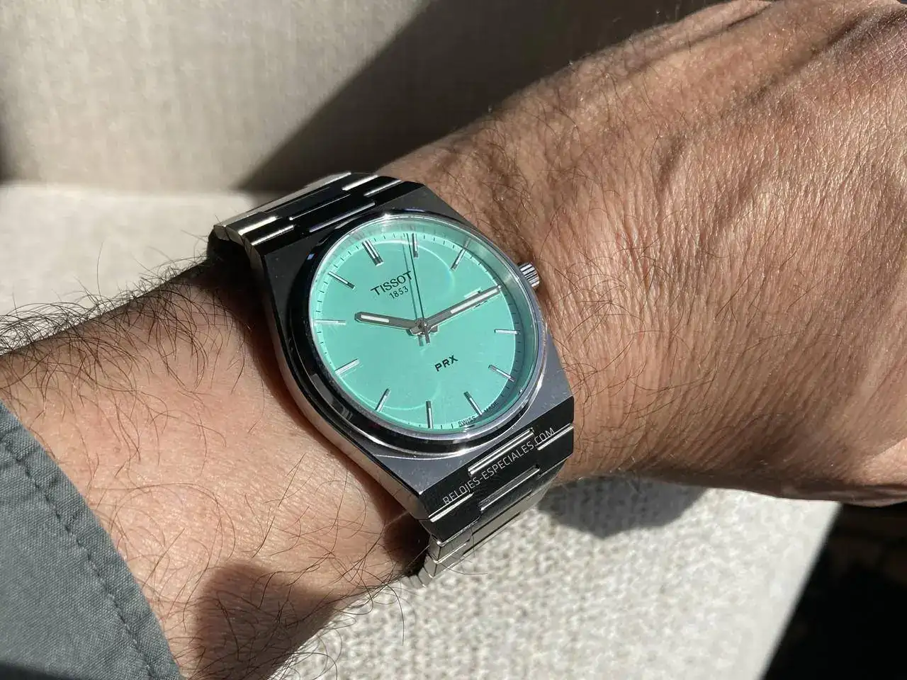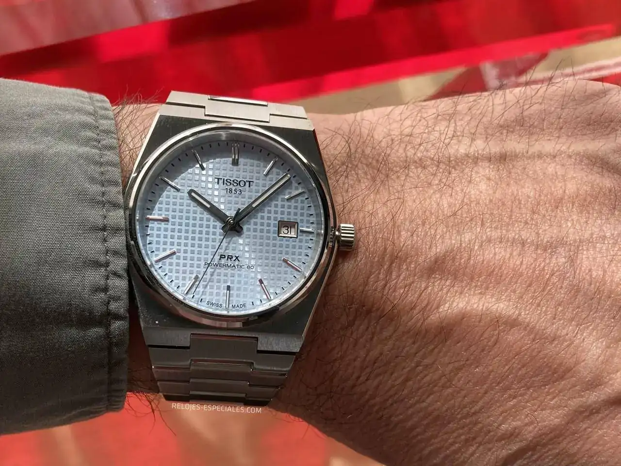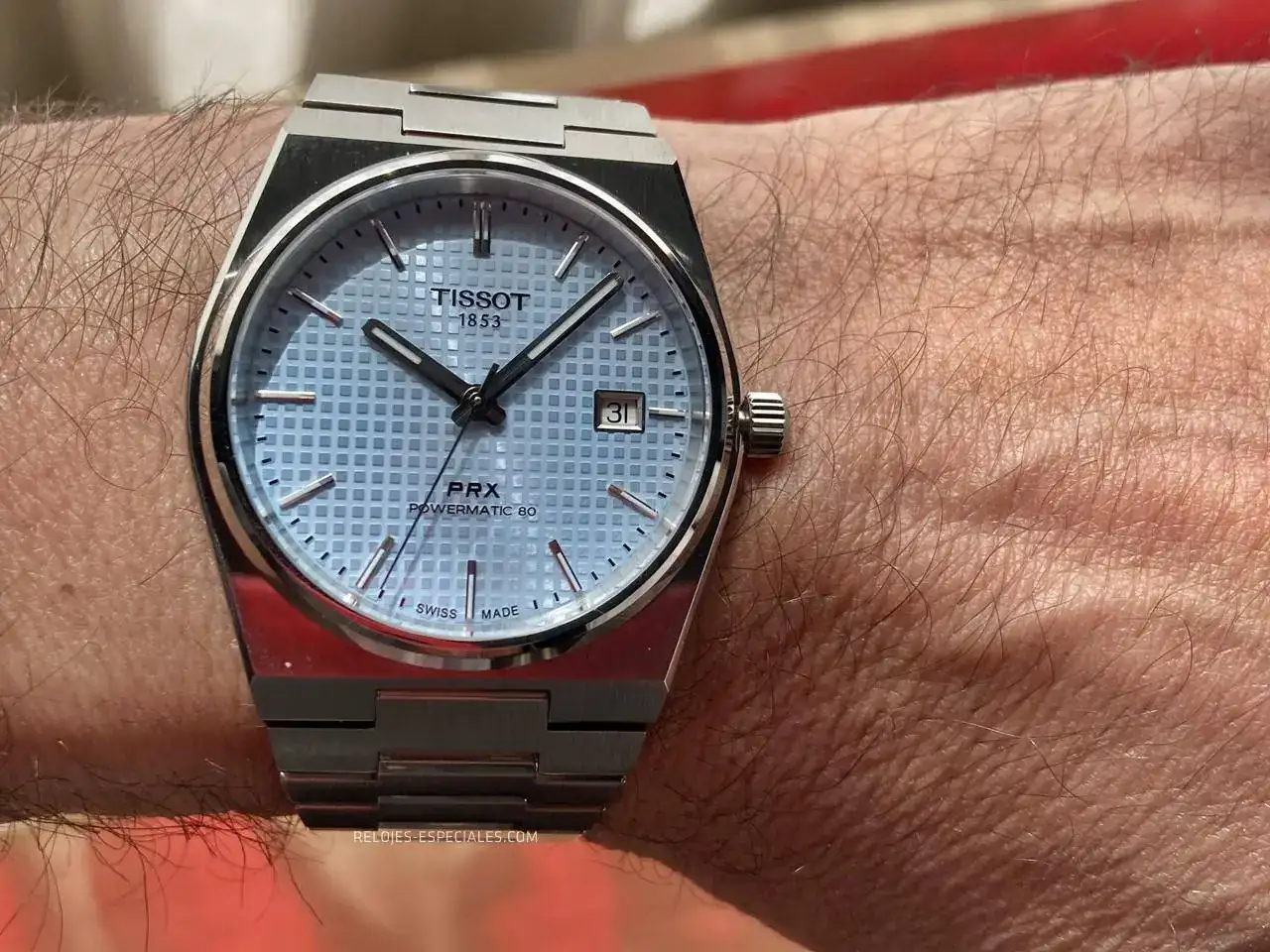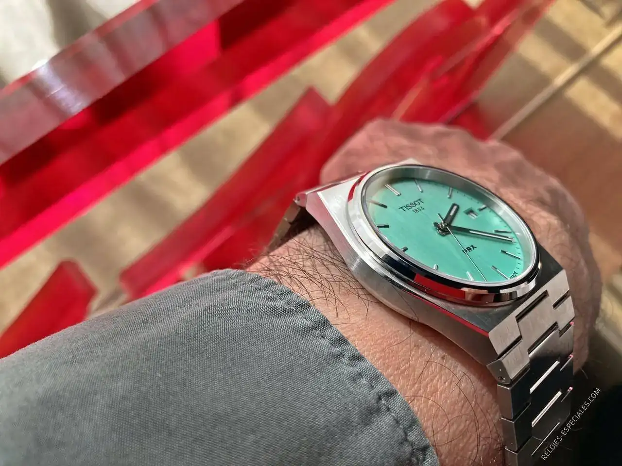 Pude ver también algunos PRX y, la verdad, me hicieron pensar en el eslogan de Pikachu: "¡Hazte con todos!" Básicamente porque los precios se mueven entre los 395 € del cuarzo con esfera lisa de color turquesa y los 795 del que equipa el Powermatic 80 y brazalete de acero. El que lleva caucho (mi preferido) baja hasta los 745 €