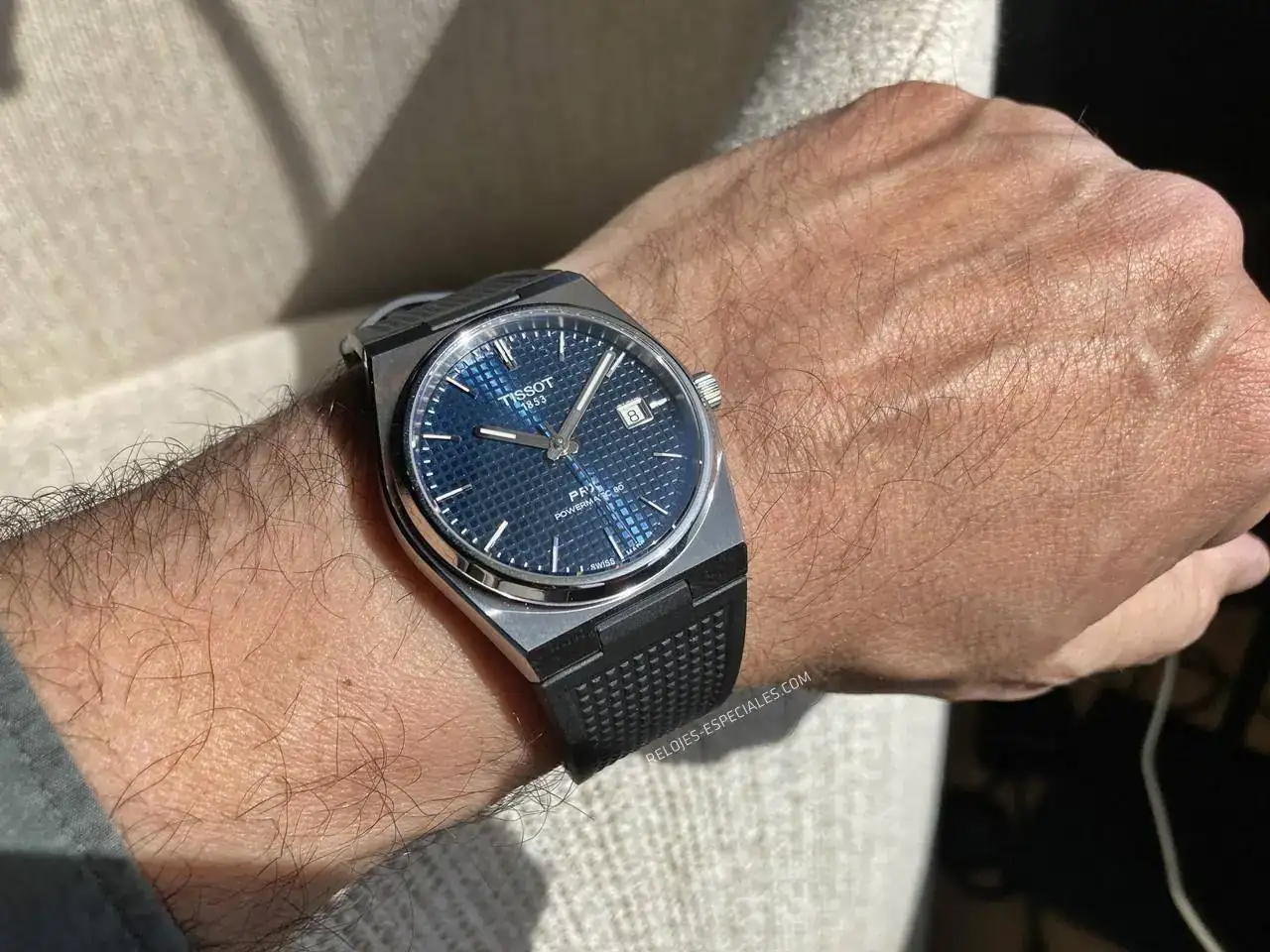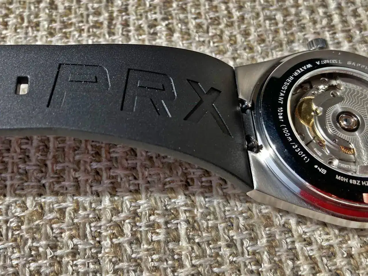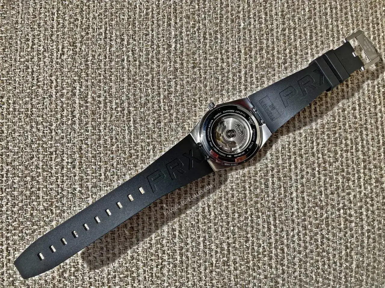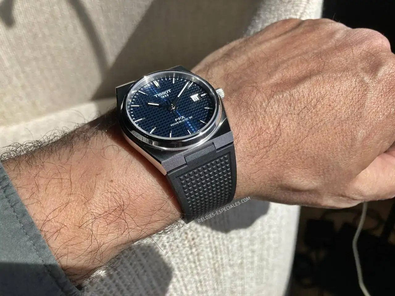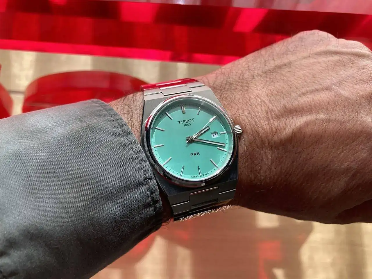 Pude ver también algunos PRX y, la verdad, me hicieron pensar en el eslogan de Pikachu: "¡Hazte con todos!" Básicamente porque los precios se mueven entre los 395 € del cuarzo con esfera lisa de color turquesa y los 795 del que equipa el Powermatic 80 y brazalete de acero. El que lleva caucho (mi preferido) baja hasta los 745 €