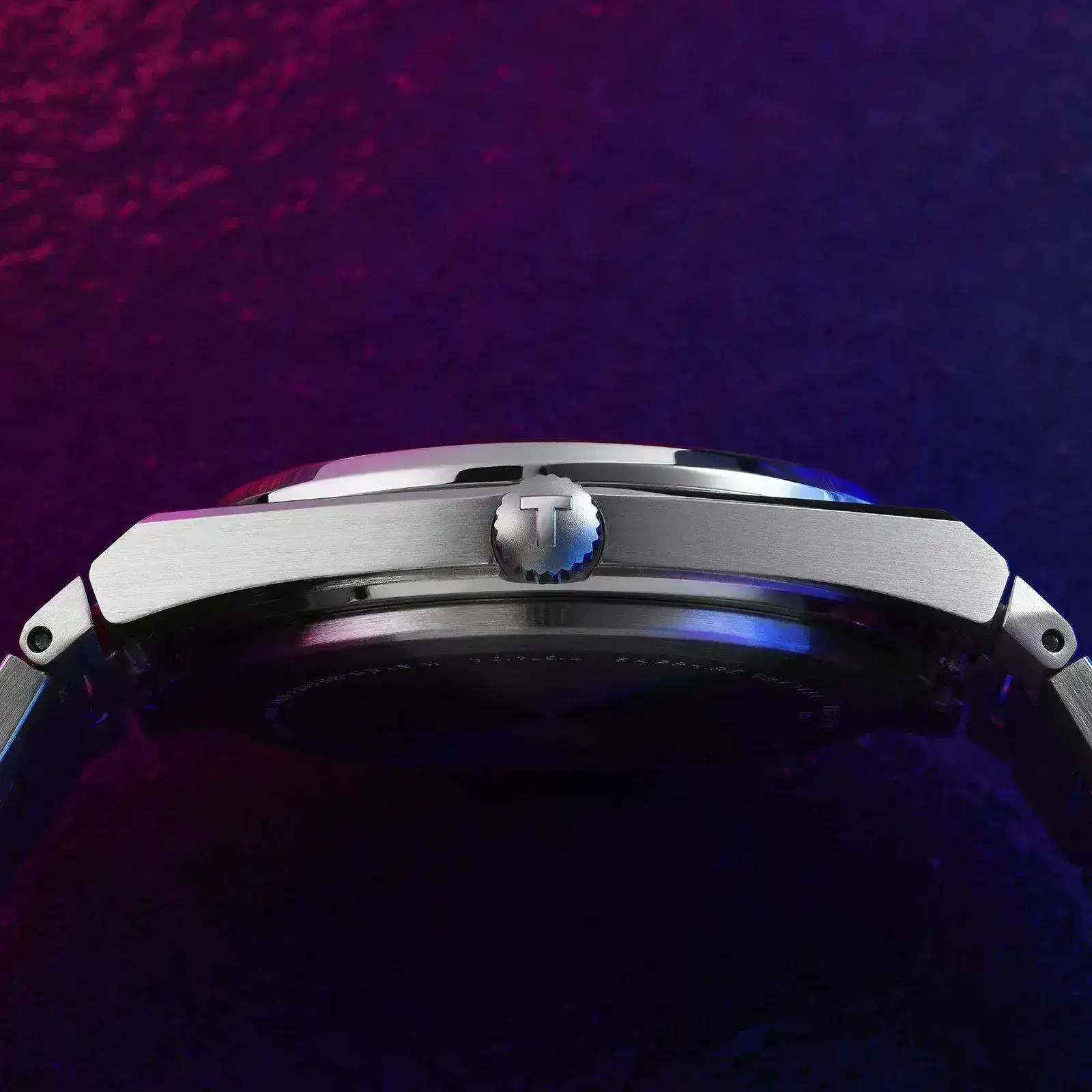 segunda fase, Tissot propondrá una versión de este futuro clásico con movimiento automático. Se reconocerá al instante por su esfera azul, negra o plateada con un motivo gofrado con relieve tipo onza de chocolate y por la inscripción «Automatic». Su interior encierra el movimiento automático Powermatic Swiss Made que late a una frecuencia de 3 Hz y ofrece una reserva de marcha de 80 horas.