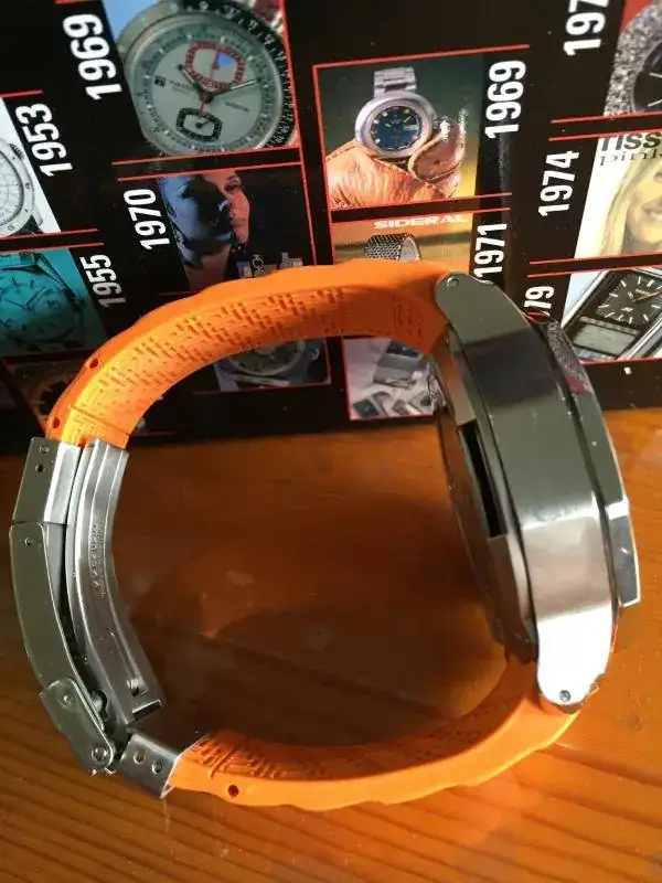 Calza un caucho naranja válido para muñecas hasta 18,5 cms,. El reloj y caucho se encuentran en un estado magnifico, salvando las tipicas cositas que se le van haciendo pero nada destacable.