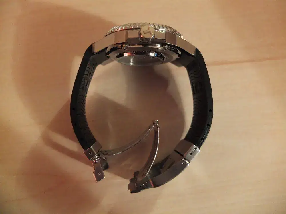 Correa: Original Tissot de goma negra, cierre de acero inox con doble anclaje. Regalo milanesa.