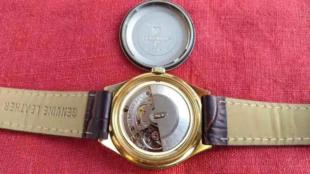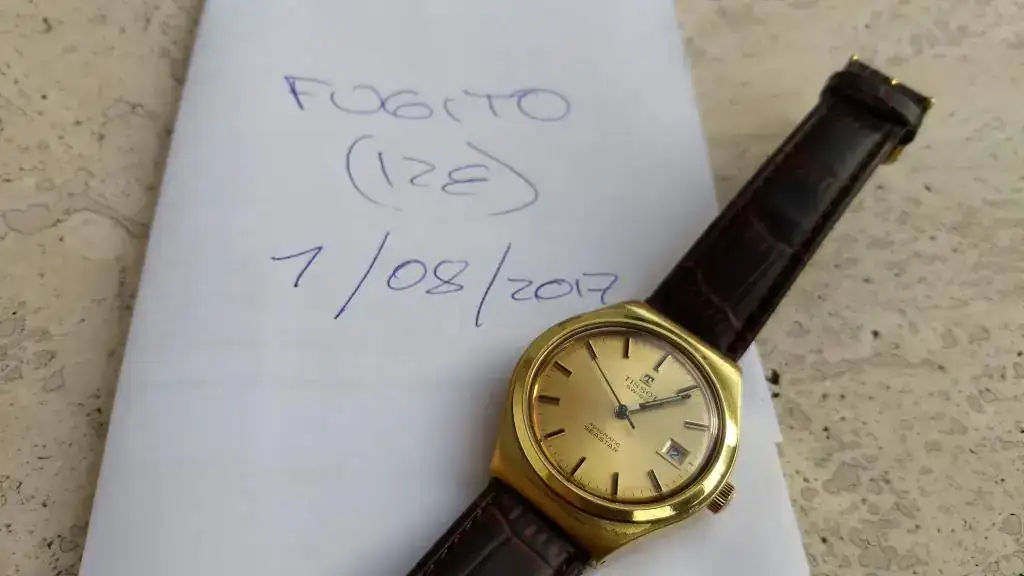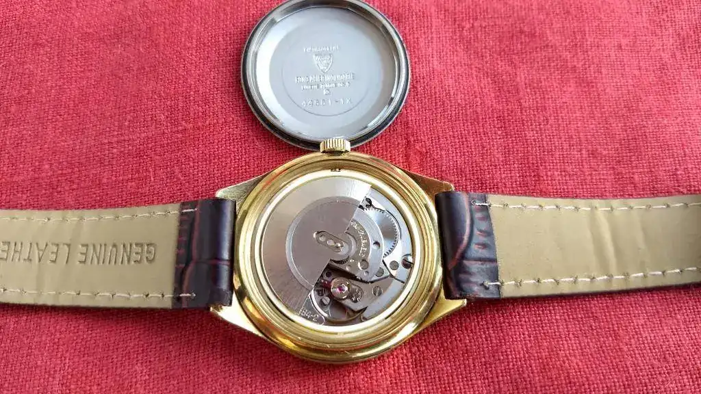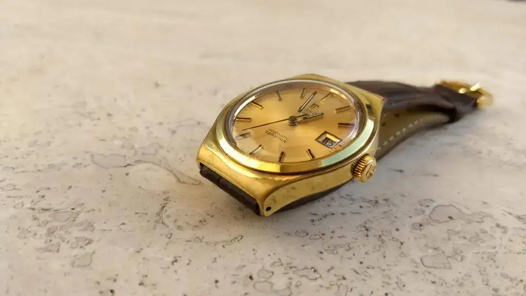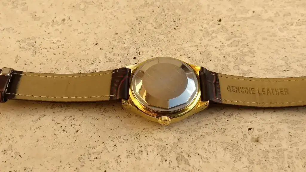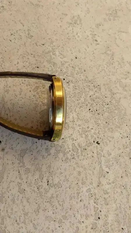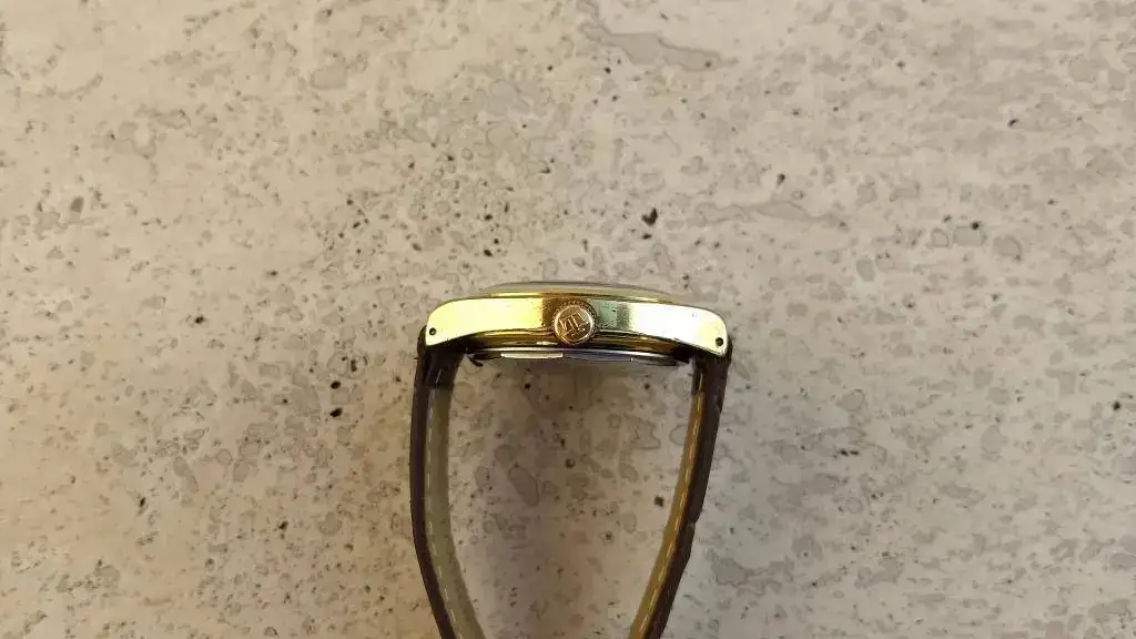 Esfera, plexy y calibre inmaculados. Los bordes de la caja tienen algo de desgaste del plaqué de oro propio de la condición vintage, se ve en las fotos pero en muñeca casi ni se nota pues el metal debajo es prácticamente del mismo color.