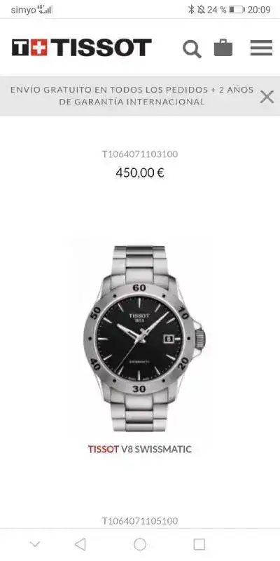 El caso es que estoy detrás de mi primer suizo y tras muchas vueltas he encontrado el Tissot Swissmatic V8 que trae muchas cosas y lo veo muy contenido de precio para ser suizo. Trae cristal de zafiro, movimiento automático suizo (claro), armis con endlinks sólidos y cierre de mariposa (nada de planchas). Me gusta que haya modelos con el bisel de acero (sin pintar) que creo que aguantarán bastante bien las rayaduras. Me queda la duda de si admite remonte manual ¿Lo sabéis? Parada de segundero ya se que no tiene. ¿Qué tal anda de precisión este calibre?