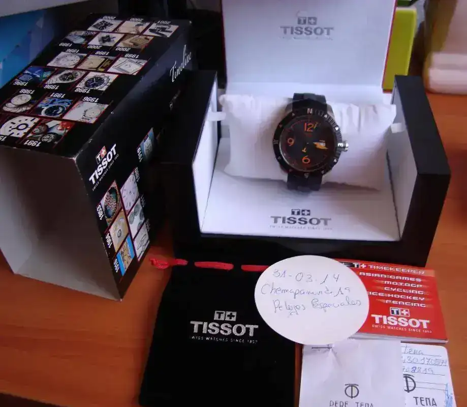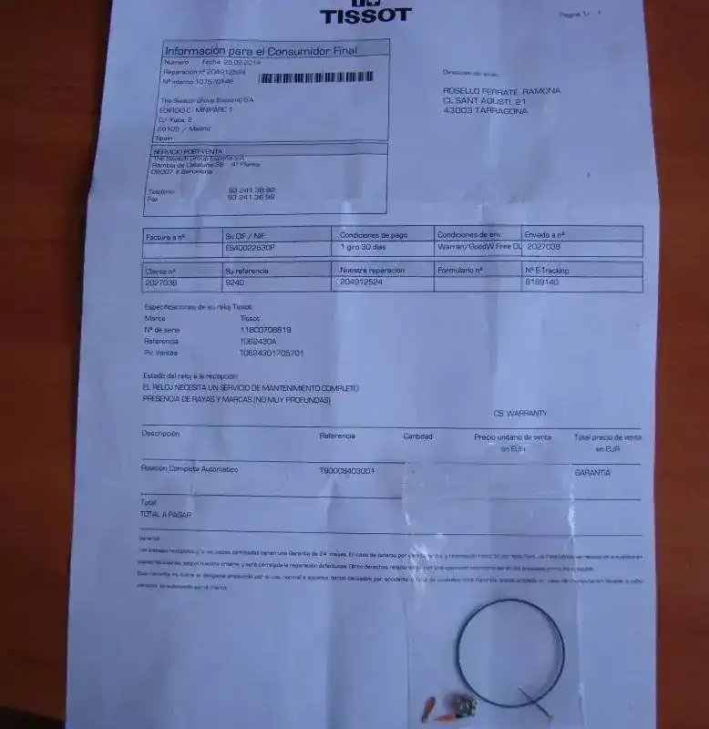EL RELOJ LO ENTREGO CON SU DOTACION COMPLETA (CAJA CARTON, CAJA TIPO BAUL, DOCUMENTACION, TARJETA GARANTIA Y FACTURA DE COMPRA ADEMAS DE LA BOLSITA TISSOT DE TRANSPORTE). Y COMO LO COMPRE EN ABRIL DEL 2012 TODABIA LE QUEDAN UNOS DIAS DE GARANTIA POR LOS DOS AÑOS DE COMPRA, PERO COMO EL DIA 25 DE FEBRERO LO LLEVE EN GARANTIA AL SERVICIO TECNICO PARA QUE LE HICIESE UNA REVISION COMPLETA (ADJUNTO FOTOGRAFIA CON DOCUMENTO DONDE DICE LO QUE SE LE HA HECHO Y TAMBIEN SE PUEDE OBSERVAR LAS PIEZAS QUE SE LE HAN CAMBIADO POR LO QUE ESTA EN GARANTIA HASTA EL DIA 25/02/2015.