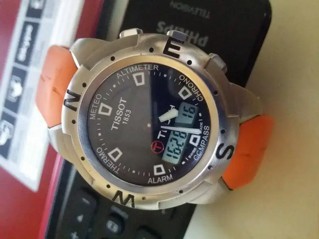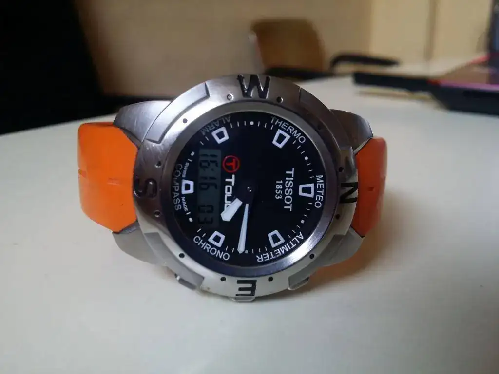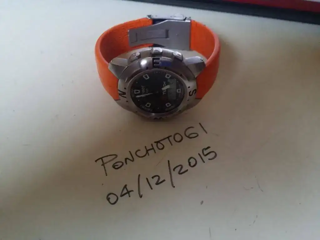 Hola, vendo mi TISSOT T TOUCH con caucho naranja, cortado para muñecas de 20,5 cm. por lo que es válida para la mayoria. Caja de acero de 42 mm., esfera analógica y digital de color negro. Cristal de zafiro impoluto con función táctil. Funciones de termómetro, barómetro, altímetro, cronógrafo, y brújula. Bisel giratorio bidireccional, estado muy bueno con las rayitas típicas del uso pero sin ninguna marca reseñable. Todo funciona perfectamente.