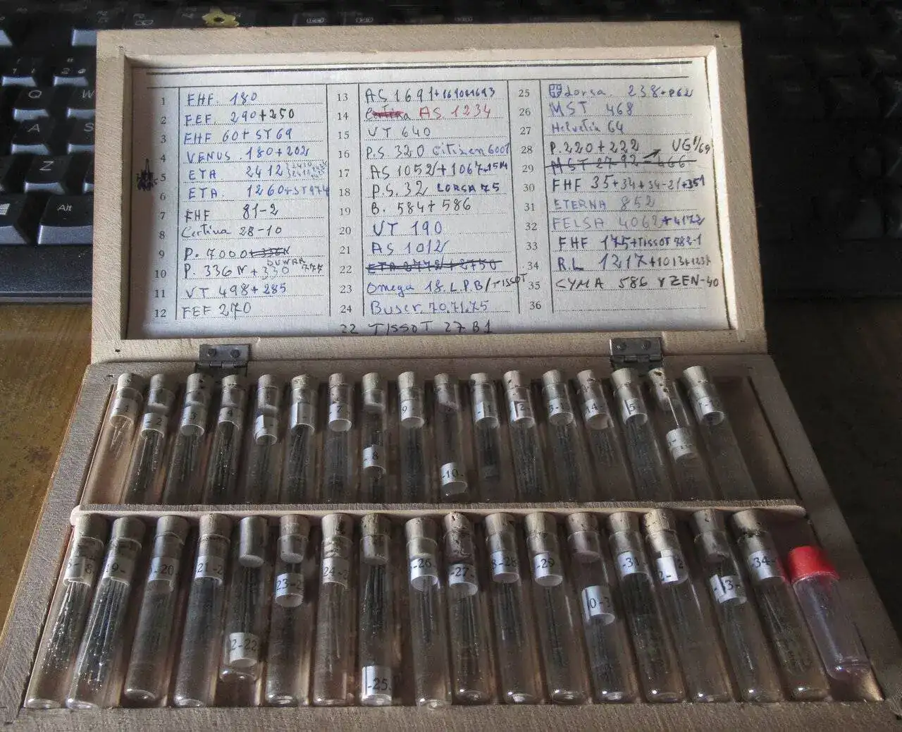 Como ya adelanté, en el jueves hice carambola. Uno de ellos, y por 10 euretes, fue este Titan, con potencial, pero sin tija/corona lo que nunca representa una gran contrariedad. Para más inri la tija del modelo venía en un estuche que compré tiempo ha en la bahía con 32 frasquitos de cristal y tapón de corcho, todo muy digital, eh?, que alojaban distintos modelos y marcas de tijas. En uno de ellos había dos tijas para Peseux 320, que es el que nos ocupa.