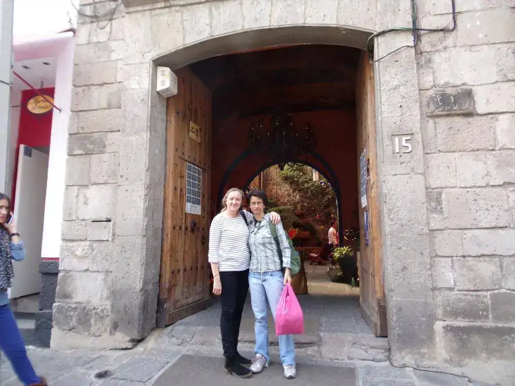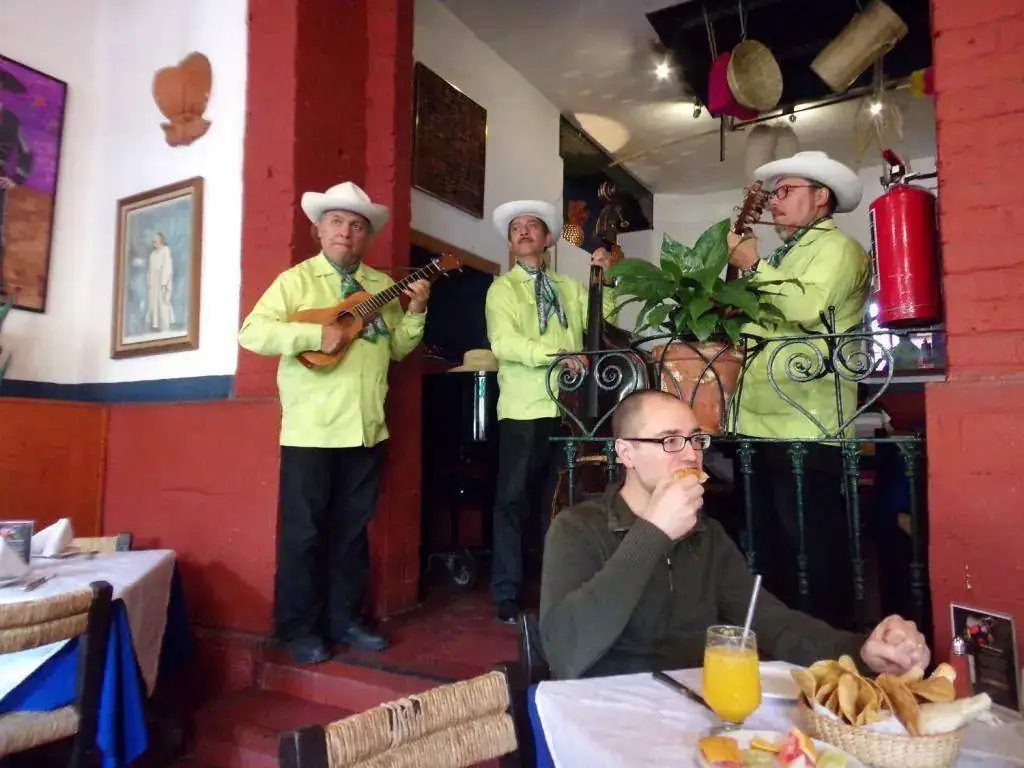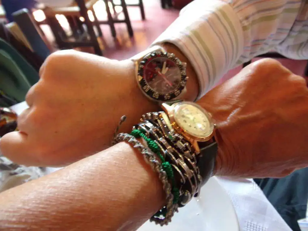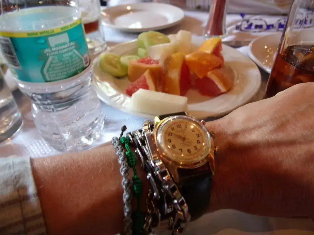 Y como el hambre arreciaba...almuerzo en restautant frente a Plaza San Jacinto. Coco y serengenge72013 muestran relojes mientras esperan platos.....
