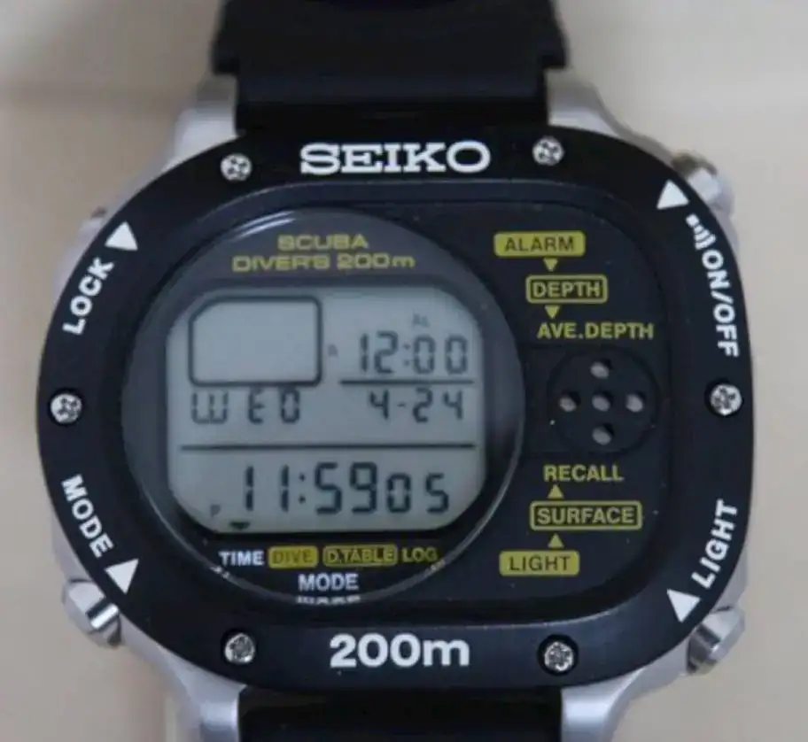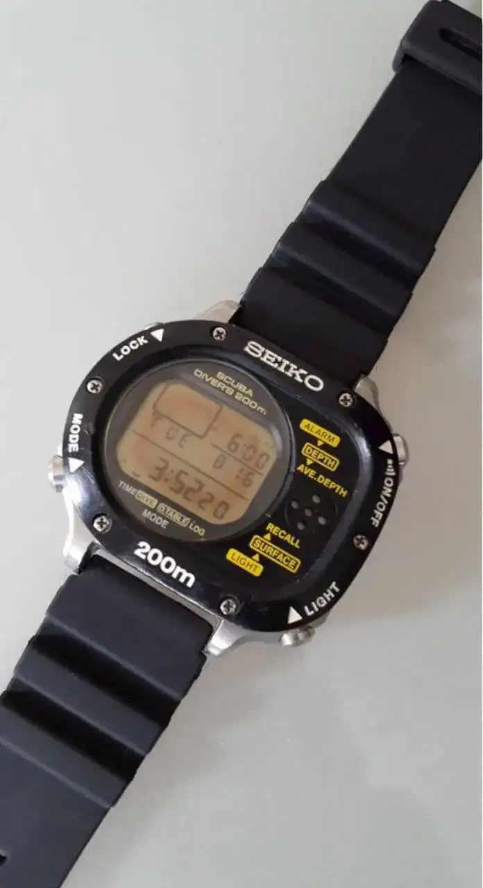 Otro reloj mítico en mi vida. Fue el segundo reloj profundímetro que tuve (después del Citizen Aqualand), aunque este desapareció de mi vida, y el Casio ocupó su lugar bajo el agua. Me ha acompañado a cientos de buceos, y ha bajado a profundidades a las que la mayoría de los buzos nunca han llegado. Lo divertido es que -aunque en el manual decía claramente que era un reloj para hacer snorkel, y no buceo con escafandra- yo ví que su límite de profundidad eran 100M (antes de que supiese realmente que quería decir eso), y pensé: "Yo nunca llegaré a esa 100 metros". Y hasta las profundidades que bajó conmigo. Siempre sin quejarse, fiel. Me encanta su función de dar la profundidad intermedia de la inmersión. Lo usé tanto, que su bisel amarillo tenía las letras no ya despintadas, sino gastadas. Y las regrabé.