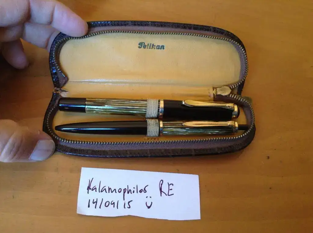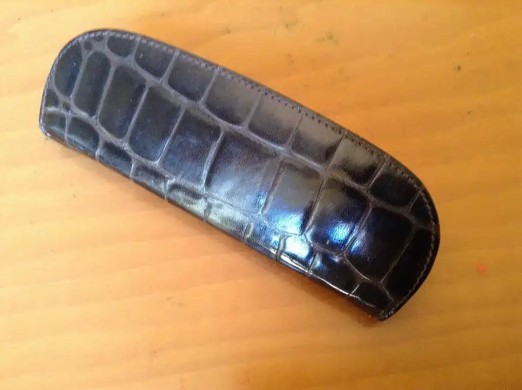 La funda es de piel, marcada Pelikan dentro y en el agarre de la cremallera. Es contemporánea del set. Acabado cocodrilo, pero yo confío (y espero, por mi conciencia) que sea piel de res con acabado y no cocodrilo de verdad