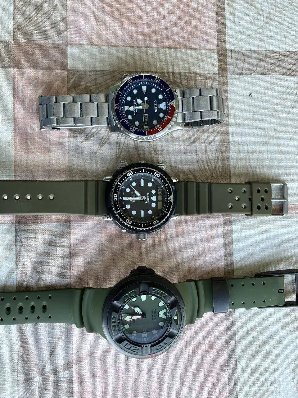 - Seiko SNJ025 “Arnie” Cuarzo solar. Ana-digi (híbrido). ISO 6425 200m con correa verde oliva Uncle Seiko.