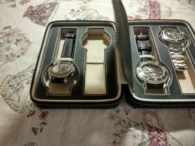 Ya me gustaría, no creas que no, pero se ve que antaño no se estilaban este tipo de estuches de transporte (o yo no los he visto). Además, los materiales de cajas, estuches y similares envejecen mucho peor que nuestros relojes y los que llegan a nuestros días están muy pachuchitos, muchos con su piel bastante reseca y delicada como para andar paseando en un bolso o mochila. Tengo varios de los de "dotación" de mis piezas, pero no salen de casa ni a tiros; además de destrozarse ellos, no son prácticos porque los relojes no van especialmente bien protegidos en su interior (salvo un par de ellos de baquelita)