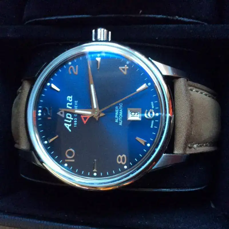 Alpina Alpiner 41.5. Me faltaba un reloj azul (peazo de criterio horológico) y tras una investigación extensa me decidí por este. Resulta que es un reloj de aventurero, así que ya puedo subir montañas. Muy bonito en persona, cumple a la perfección el papel de reloj azul.