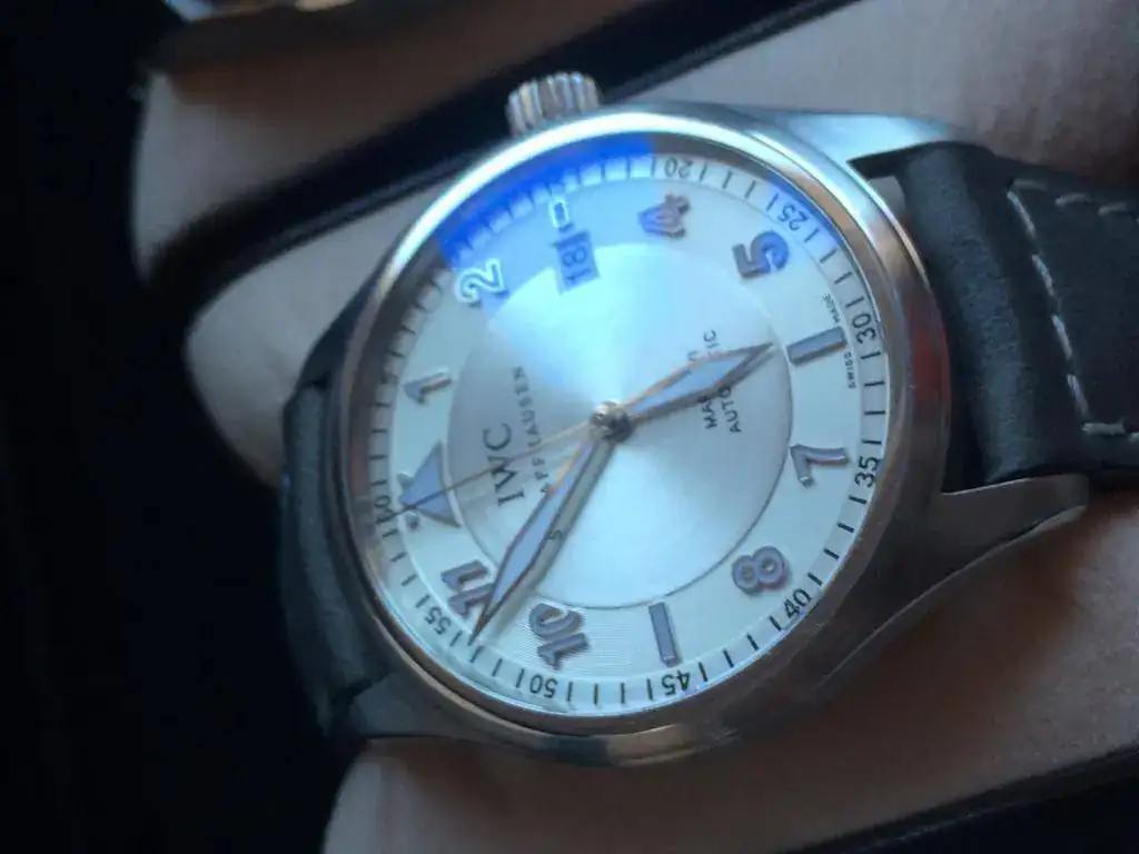 IWC Mark XVI: el reloj con más clase que tengo. No soy aviador, pero siempre quise serlo. Fiable, discreto, acabados de 1a. Te puedes pasar horas mirando el dial, que cambia de blanco a plata con toques azulados según le de la luz. Le puse una correa de Jacobo que le da un empaque notable.