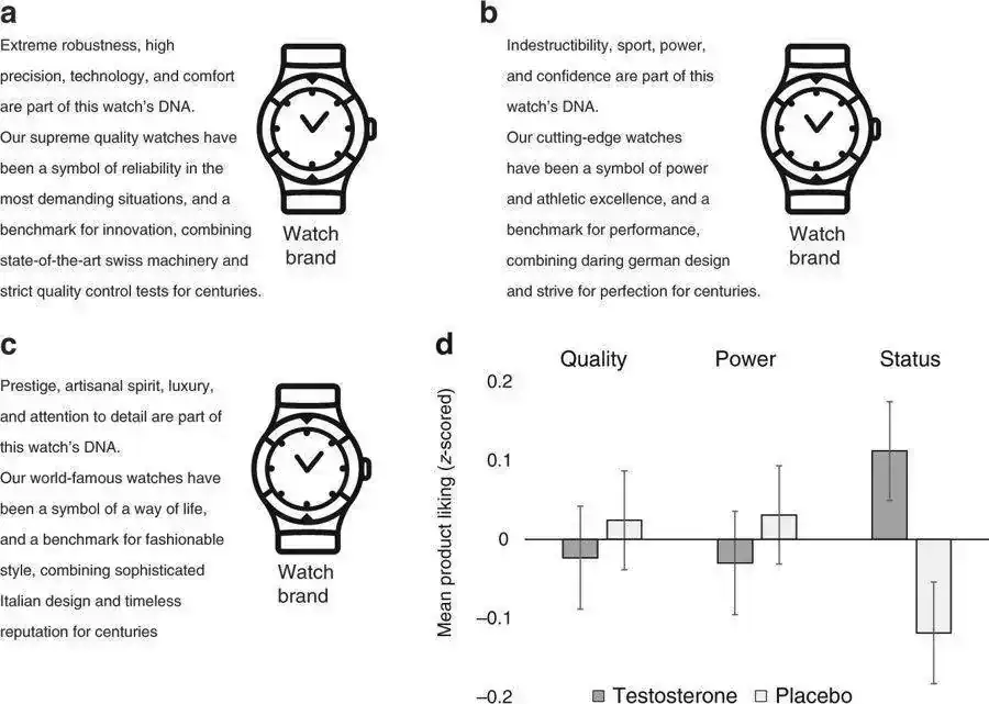 Revista científica Nature: Tras inyectarles testosterona, en hombres aumenta la atracción por objetos de lujo que proyectan estatus. Entre estos objetos que se usaron para el estudio, están los relojes de lujo. Tras inyecciónes de testoterona, se observó un cambio de preferencia por ciertas marcas, solo la percepción de estatus cambiaba en ellas, no la de calidad o préstaciones.
