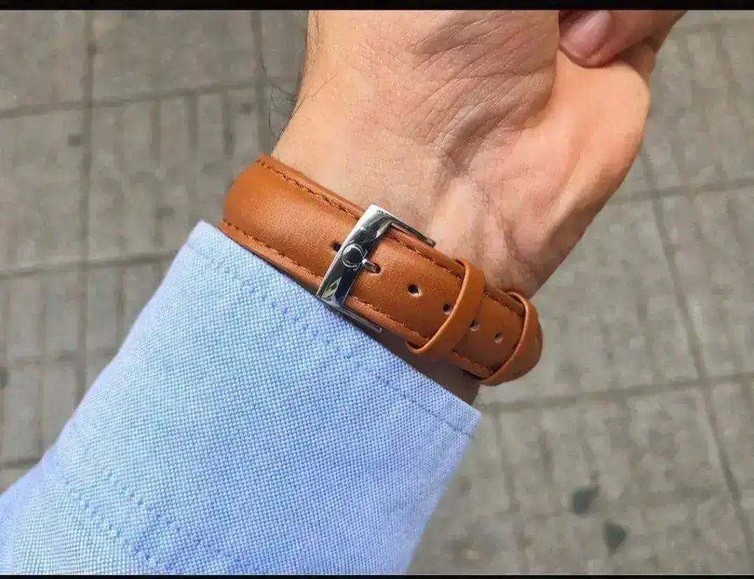 El color de la correa no esta mal y es elegante. Lo que no megusta es, que esta forrado. Para este tipo de reloj megustan correas con 2,5 hasta maximal 3,0mm de espesor. Estas correas gordas matan el reloj.