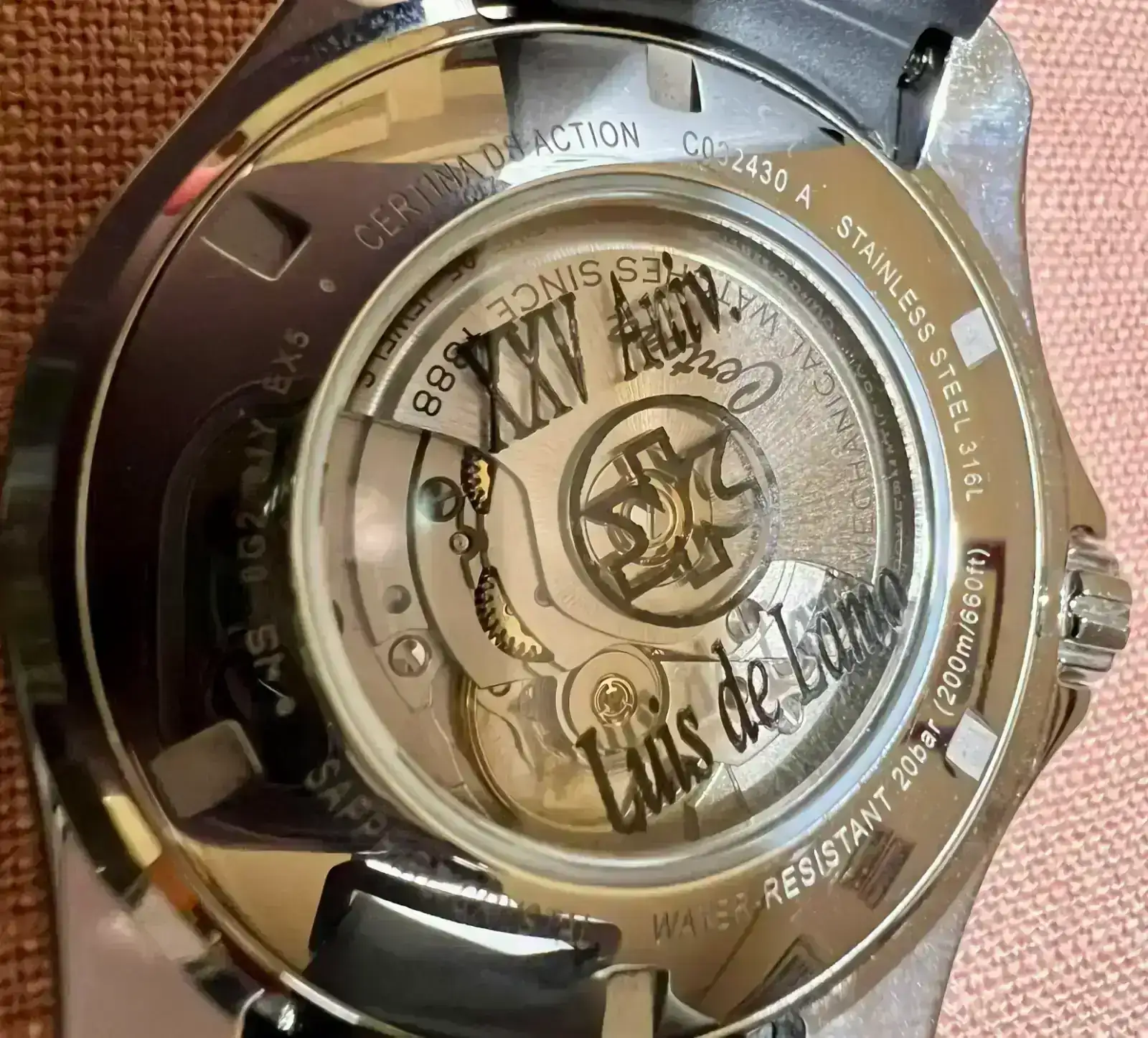 Certina DS ACTION. Pongo este como ejemplo de una costumbre que antaño era más frecuente, y ahora está cayendo cada vez más en desuso. Concretamente, es el reloj que me regaló la empresa por los 25 años de trabajo. Antes regalaban omegas de oro con el grabado sobre la tapa trasera. Ahora te ponen el nombre con algún tipo de tinta sobre el fondo visto, y ya no es Omega, pero bueno. También hace ilusión… 🥹