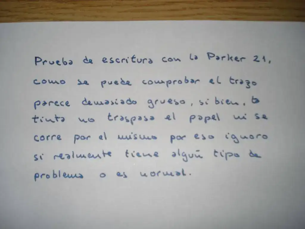 Pero como no todo puede ser perfecto le veo un problema y es que el trazo es grueso, grueso, una auténtica brocha (quizás de ahí venga esa suavidad). Yo pensaba que Parker fabricaba este tipo de plumas con plumín fino o medio nada más pero no lo se. Quería aclarar que el estado es impecable en cuanto a estado de conservación y podría pasar por nueva con lo que excluyo que haya sido maltratada, así mismo ignoro si es un problema de desgaste, desajuste o simplemente que se construyó con un punto grueso y no existe tal problema.
