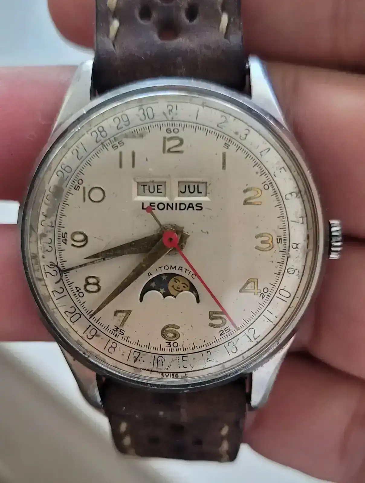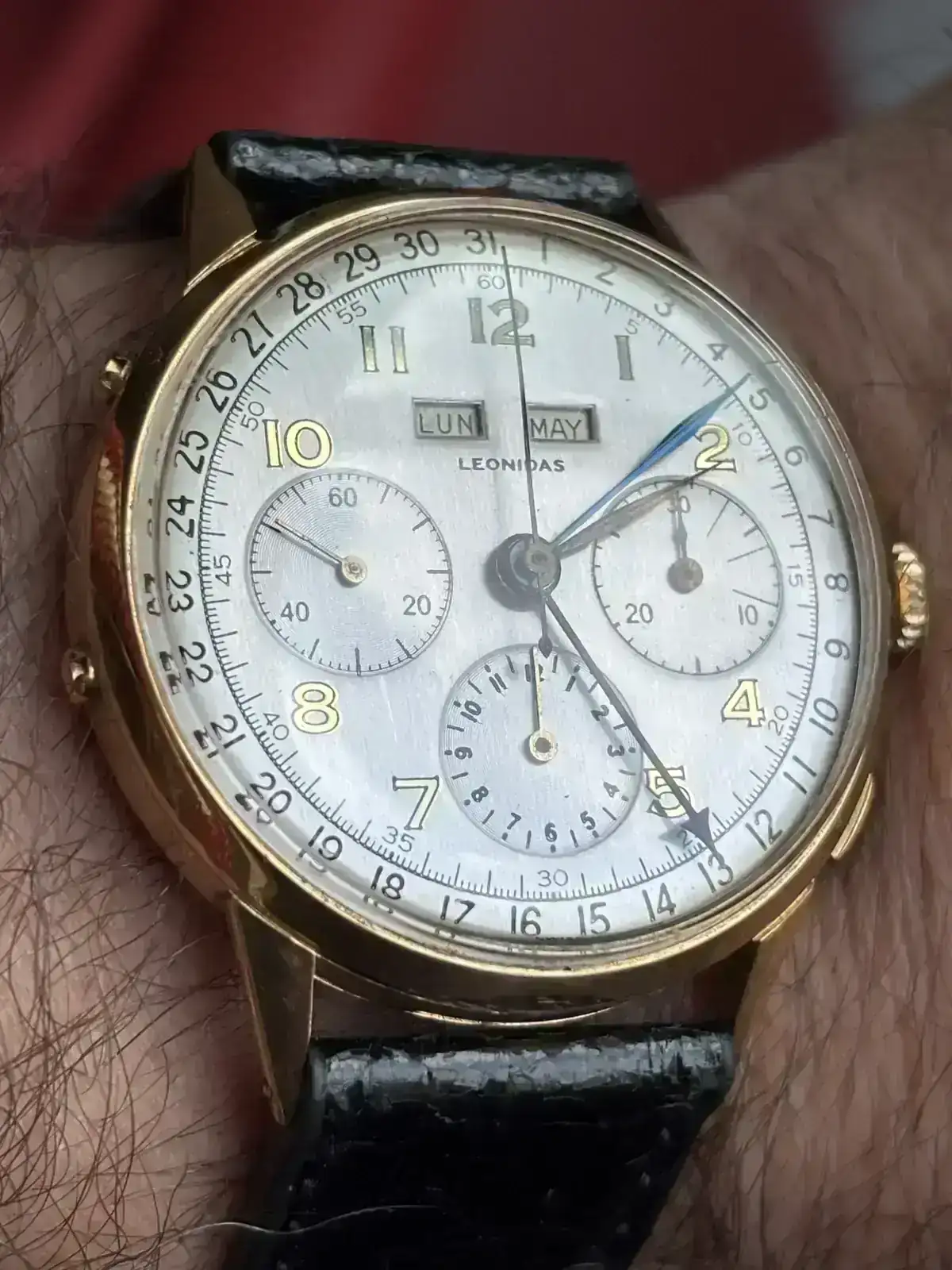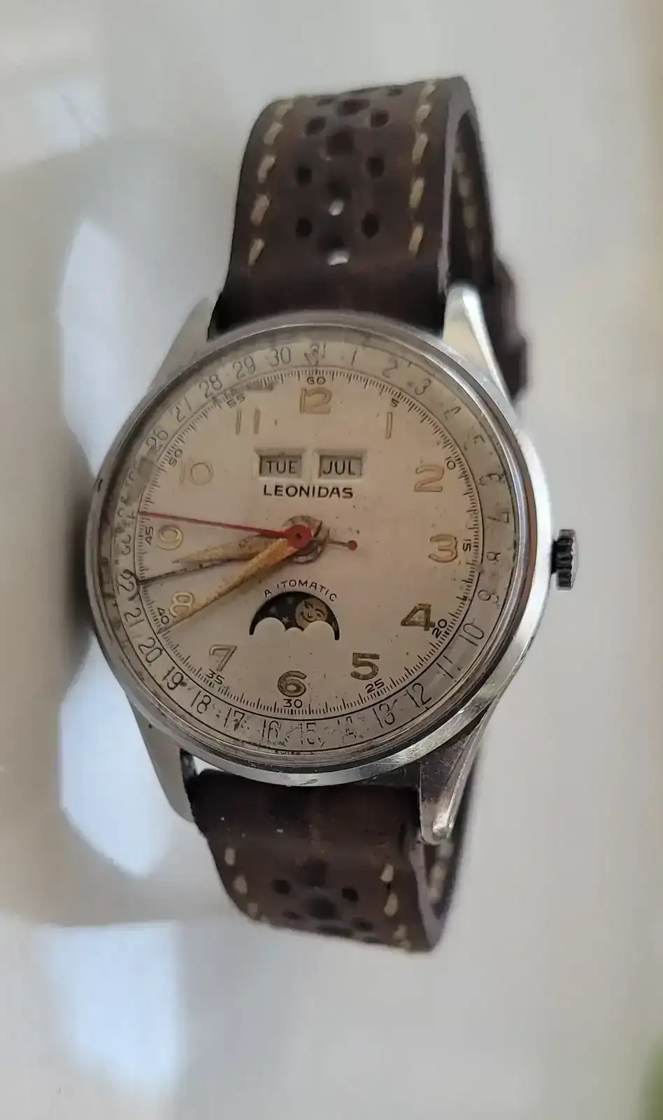 El elegido es este bonito Leónidas, con triple calendario y fase lunar, con el que tuve un flechazo en cuanto lo vi. Por una extraña paradoja, nunca me ha atraído para nada cuanto tenga que ver con la luna o la astronomía en general; pero la fase lunar es una complicación que siempre me ha gustado.