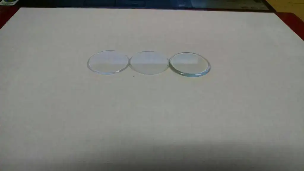 En esta foto comparativa, se aprecia a la izquierda el cristal original que fue sustituido por uno genérico o de refacción; el cristal del centro es similar en altura, pero no esta biselado aún y el de la derecha ya fue biselado. Al momento de realizarse el biselado el cristal de refacción cambia de color, a un tono azulado, por esta característica se puede identificar entre un cristal genérico y uno original, en este último el tono de color es uniforme y se siente más ligero, además el biselado es más delgado o fino.
