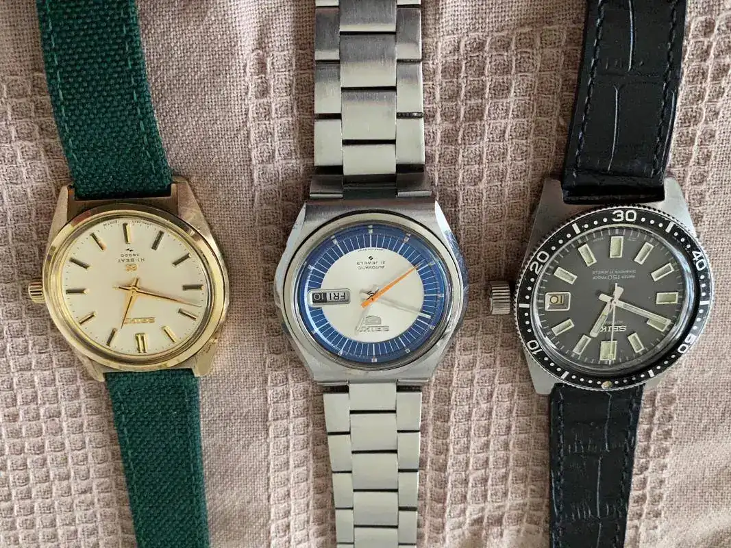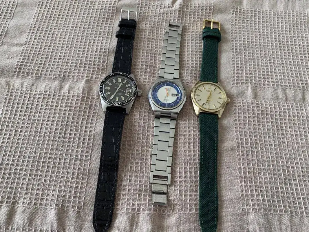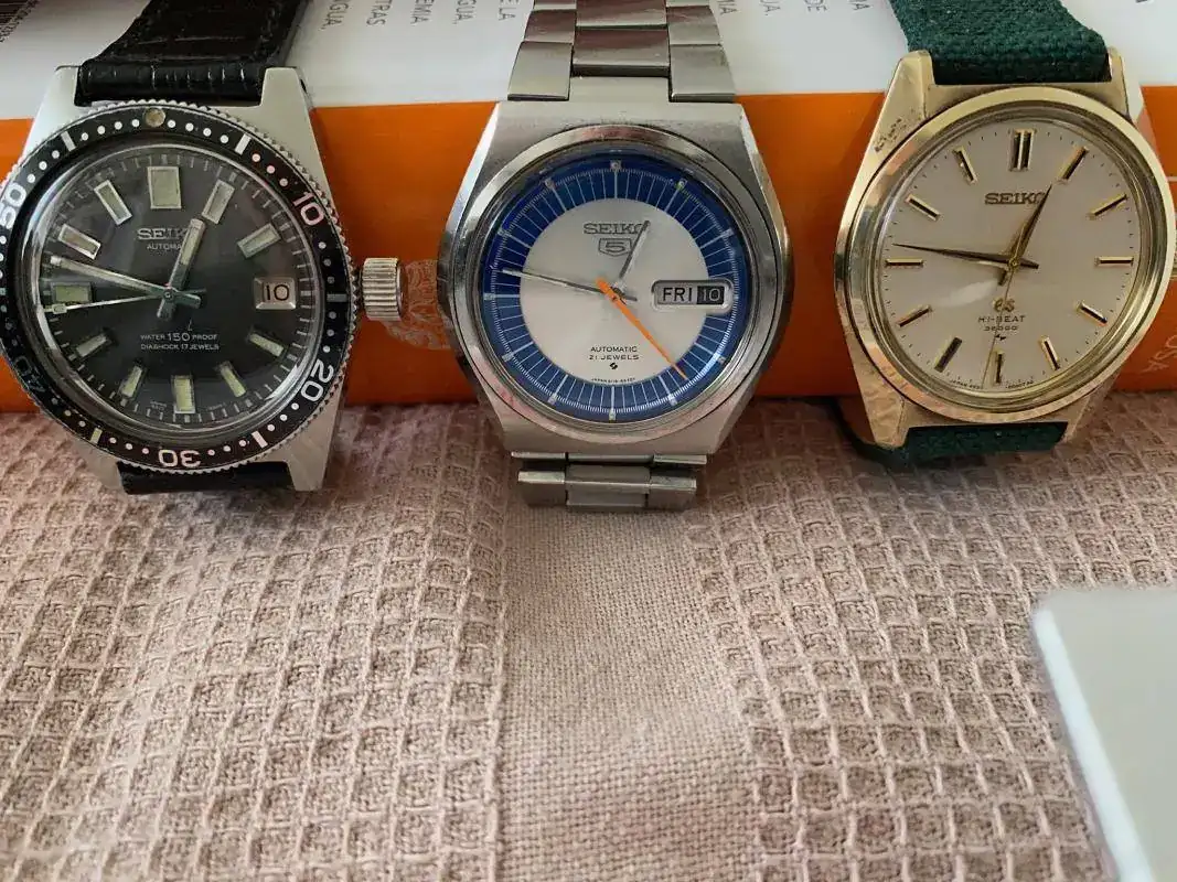 Y sin más preámbulo aquí están los tres relojes a los que me referiré: un Seiko 6217-8001 (conocido como Seiko 62Mas), un Seiko 5 6119-8500 y un Grand Seiko 4520-8000. Es decir, un reloj deportivo -el primer reloj de buceo serio de Seiko; un reloj popular de la conocidísima serie 5 de Seiko; y un reloj que corresponde al primer intento de Seiko por fabricar modelos en condiciones de competir con las grandes marcas asentadas en el rango de relojes de más categoría, por no decir de lujo, y de desmarcarse de la imagen de marca productora solo de relojes económicos, y en forma masiva.