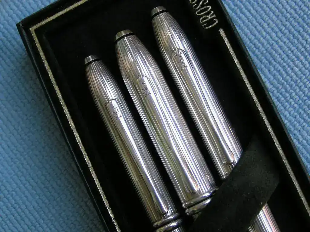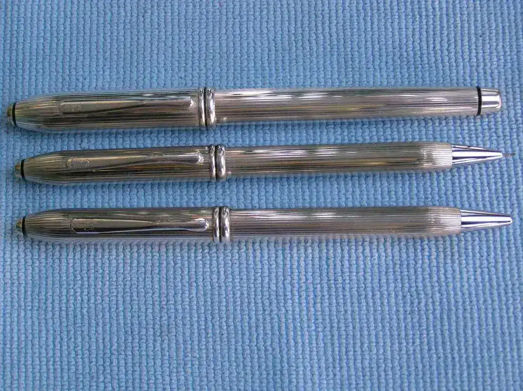 En este caso presento a las ”trillizas de plata”, Pluma, bolígrafo y portaminas, qué no lapicero, del modelo Cross Townsend en acabado sterling, o sea en plata maciza.