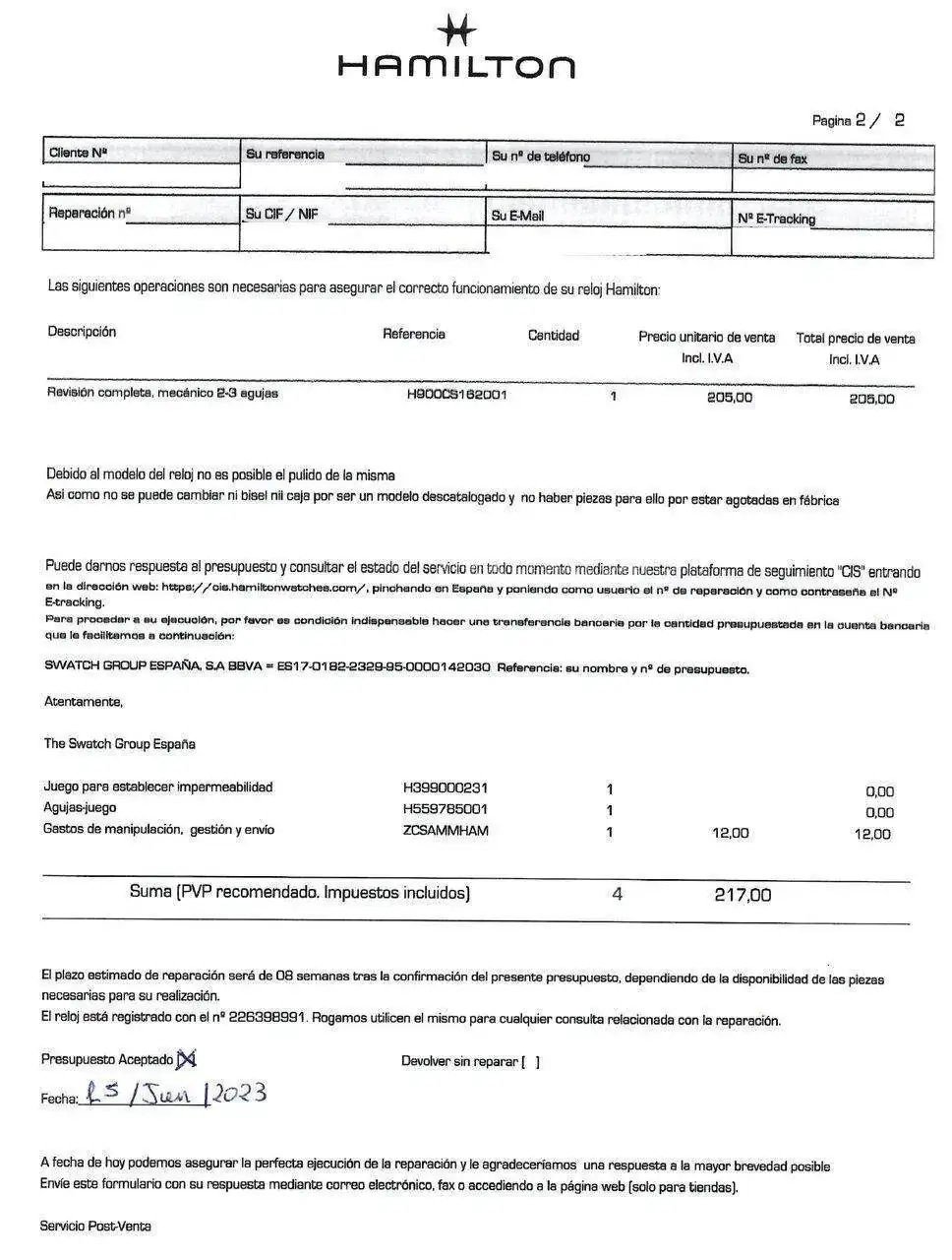 Tras esto cuando reciben el reloj me llega un justificante y un presupuesto donde se me indica lo que le van hacer al reloj, en esa revisión se incluye una “revisión completa, mecánico 2-3 agujas” y me avisan que no van a poder realizar un pulido por el tipo de caja, lo asumo ya que lo único que tiene el reloj es el tema del datario, el estado de marcha es perfecto y los desperfectos de la caja no me preocupan ya que lo uso bastante y son normales, asumo el presupuesto y realizo el pago (si es verdad que lo realice tarde ya que se me paso) pero lo realicé.