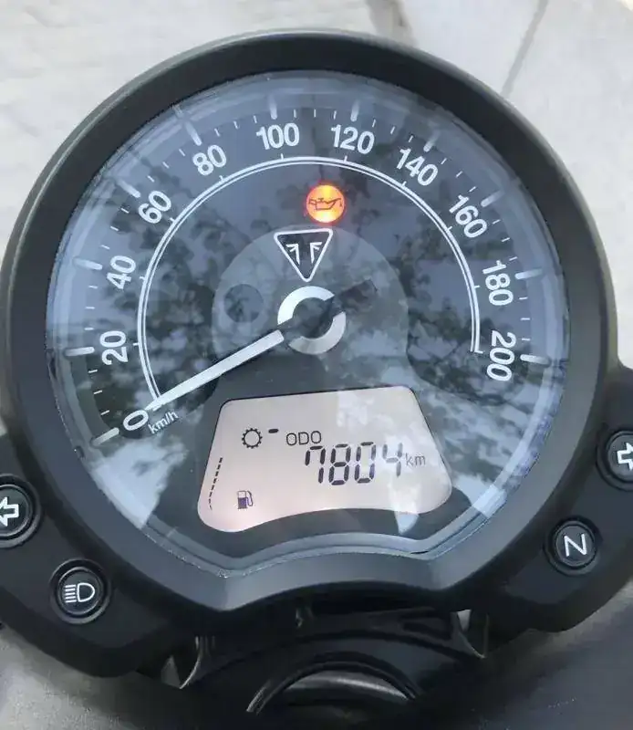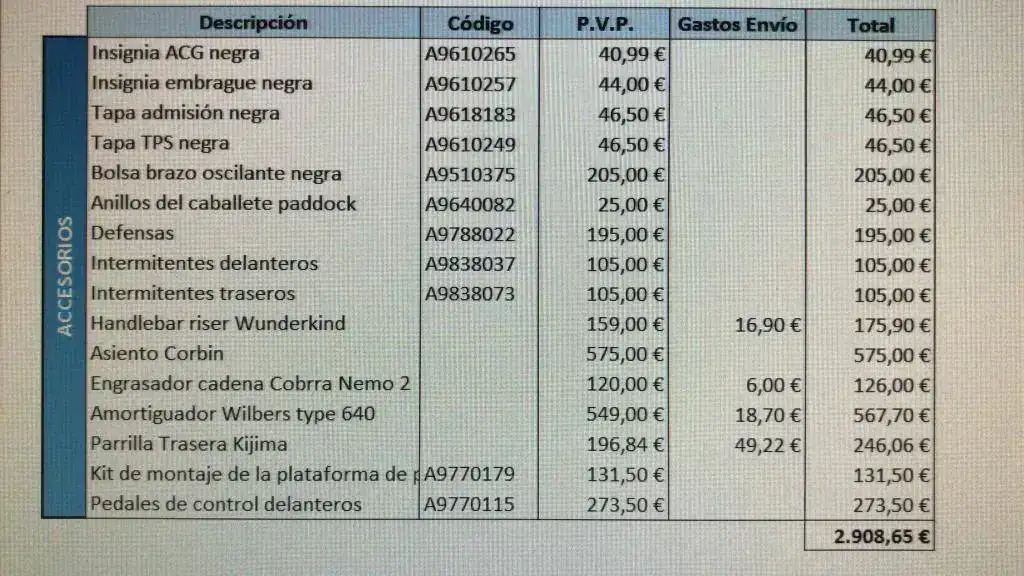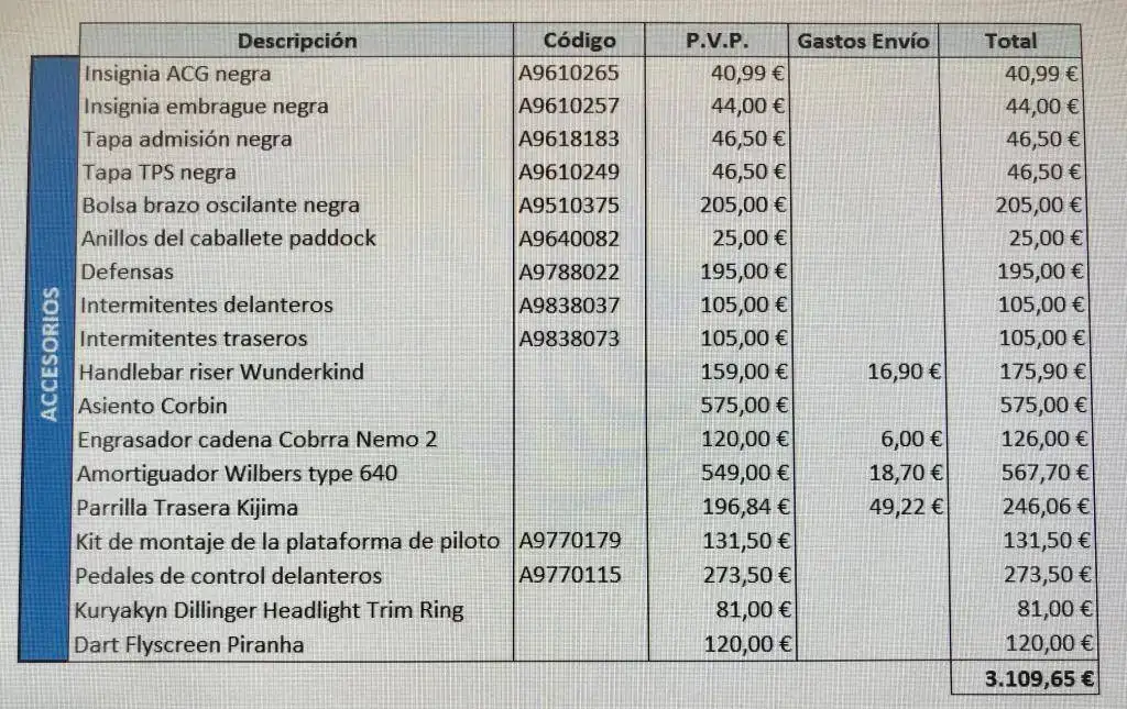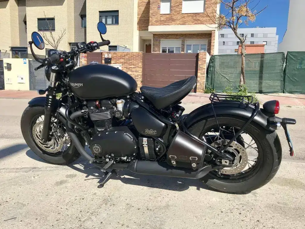 De extras lleva un valor de 2.500€ (que sumados a los 14.600€ de la moto hacen 17.1000€ de motaza) entre los que destaca el asiento Corbin, amortiguador Wilbers, intermitentes led triumph, parrilla de equipaje, defensas, engrasador de cadena, torretas elevadas, defensas, bolsa lateral, tapas, etc.