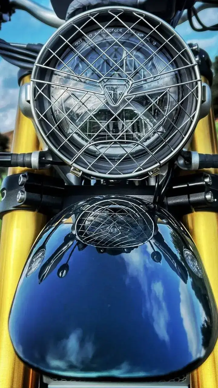 Como extra a lo que venia de la casa dispone del protector de faro de rejilla y una funda también original Triumph .
