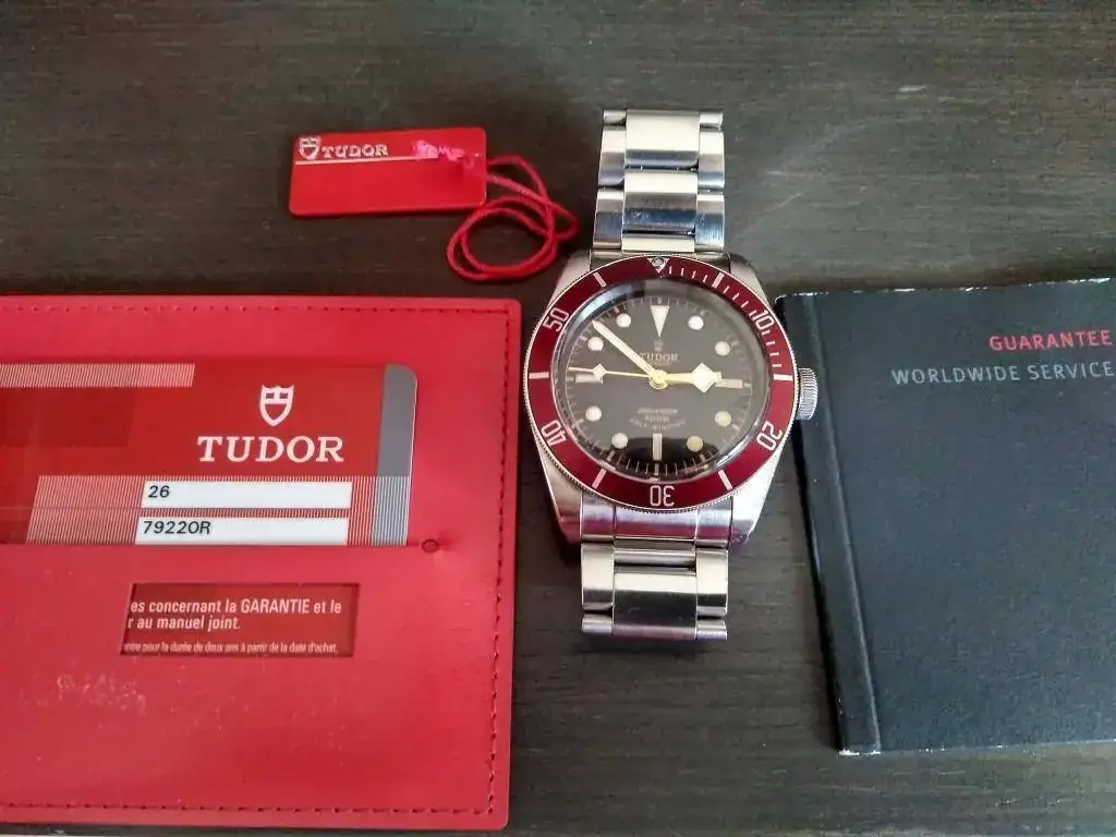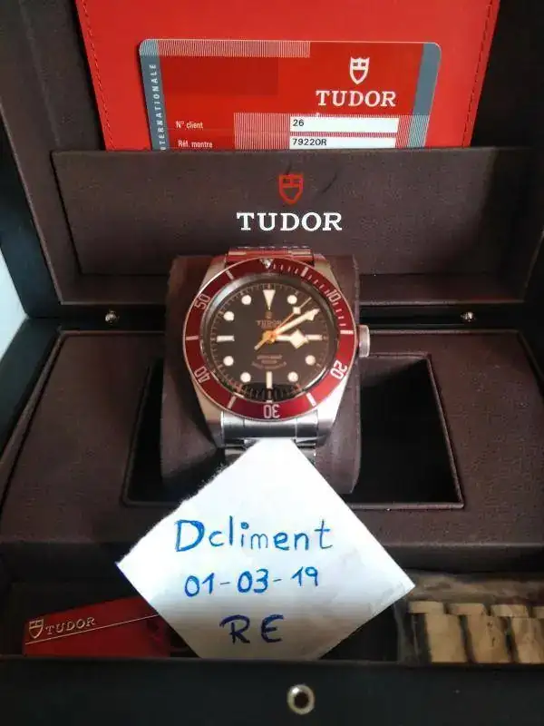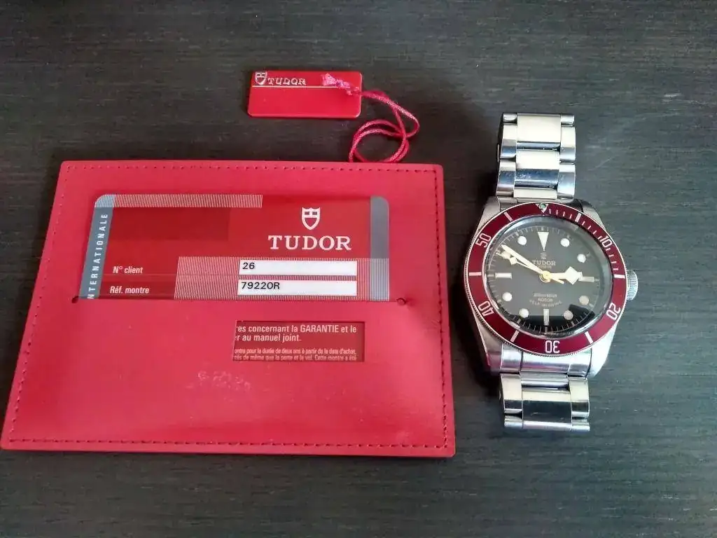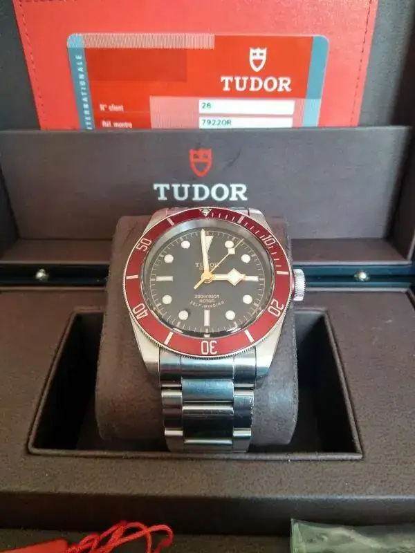 El reloj viene completo con su caja de cartón exterior, caja negra lacada de Tudor, lacres, tarjetero, libro de instrucciones y tarjeta de garantía sellada y expirada.