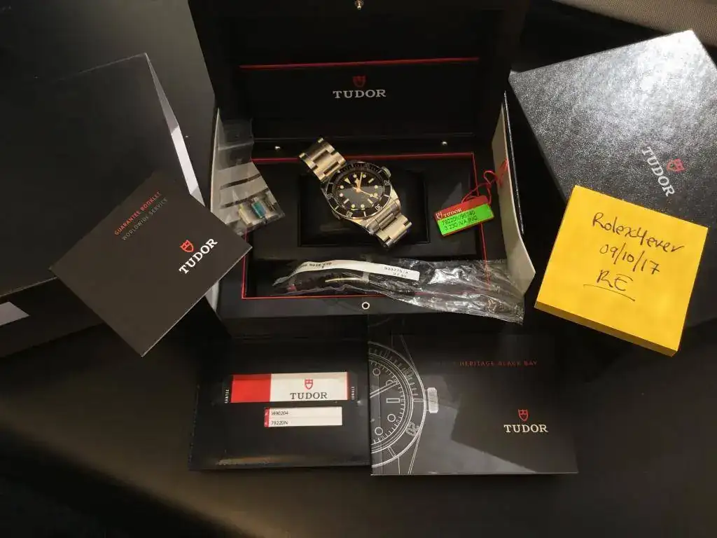 Vendo uno de los últimos Black Bay negros no manufactura que quedan en estas condiciones. Tiene todas las pegatinas puestas, ha estado básicamente en la caja fuerte desde que lo compré en Noviembre de 2016. Lo he sacado sólo para tomar fotos en algunas ocasiones. Es el último Black Bay negro con brazalete que se vendió en mi concesionario habitual. Como siempre con mis relojes, la garantía está a mi nombre y está fechada.