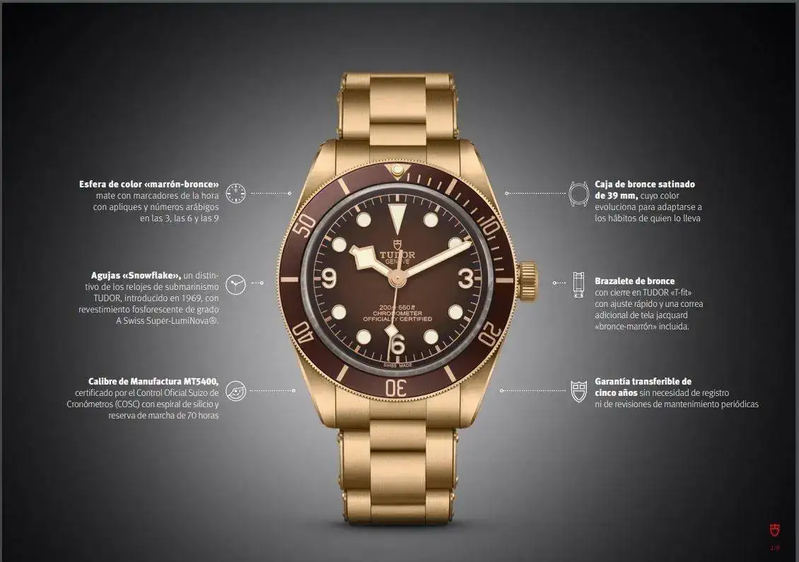 el modelo Black Bay Fifty-Eight Bronze es el primero en el que la marca produce un brazalete completamente de bronce. Sus eslabones satinados adoptan el estilo de los brazaletes TUDOR de las décadas de 1950 y 1960, y van a juego con la caja. Ambos desarrollarán su pátina al mismo ritmo. Un nuevo cierre de bronce, también satinado, con una cubierta rediseñada y un sistema de ajuste rápido en TUDOR «T-fit» para adaptar el largo, remata la estética en bronce. Este sistema de fácil manejo y que no requiere herramientas, ofrece cinco posiciones y permite un ajuste instantáneo.