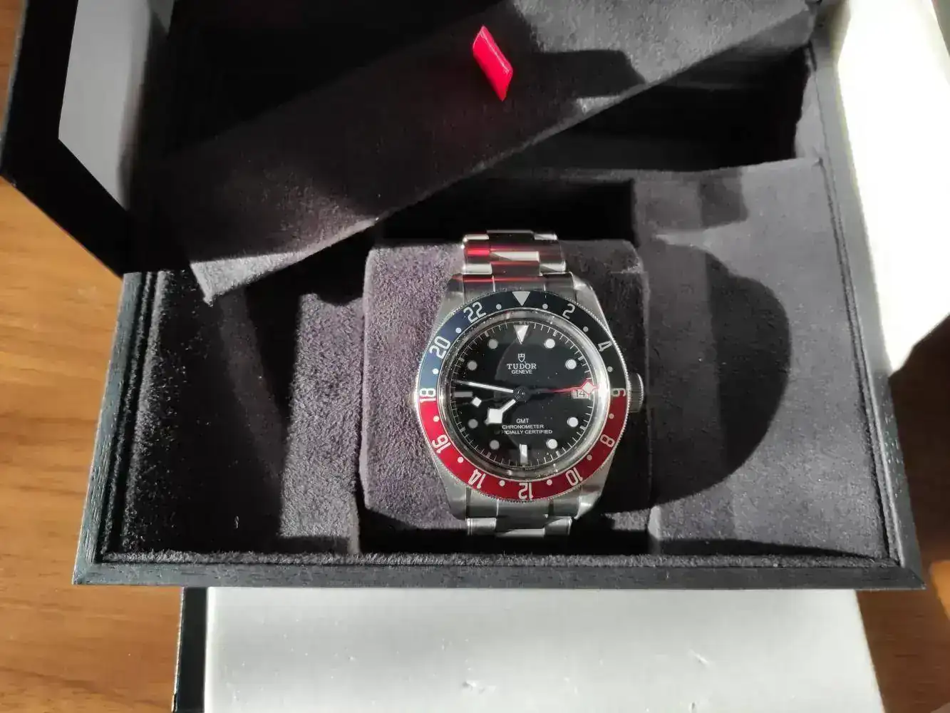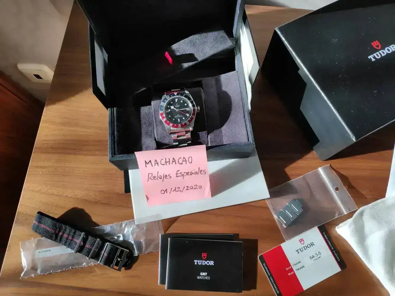 Reloj comprado en C.O. NACIONAL en Agosto de 2018 y completo con toda su dotación compuesta por caja interior de cartón negra con logo Tudor, estuche guardarreloj con logo Tudor y terciopelo negro, libro de garantía, libro de instrucciones y tarjeta de garantía sellada y fechada en Agosto de 2018, por lo tanto en garantía oficial Tudor (la marca ofrece 5 años). En octubre de ese mismo año, 2018, pasó una revisión oficial para corregir el problema del fechador por lo que el calibre está ya exento.