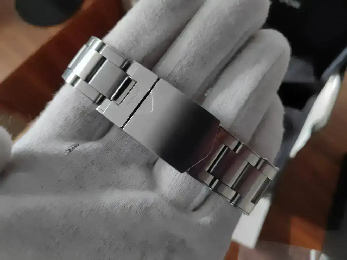 CORREA: brazalete de acero, eslabones con remaches, acabo pulido y satinado con cierre desplegable y sistema de seguridad. Se incluye la NATO original con hebilla firmada sin estrenar.