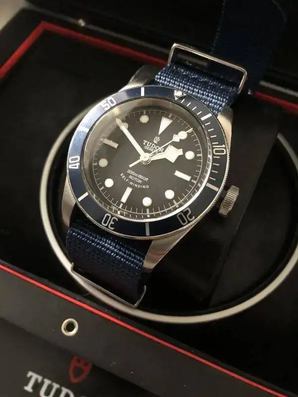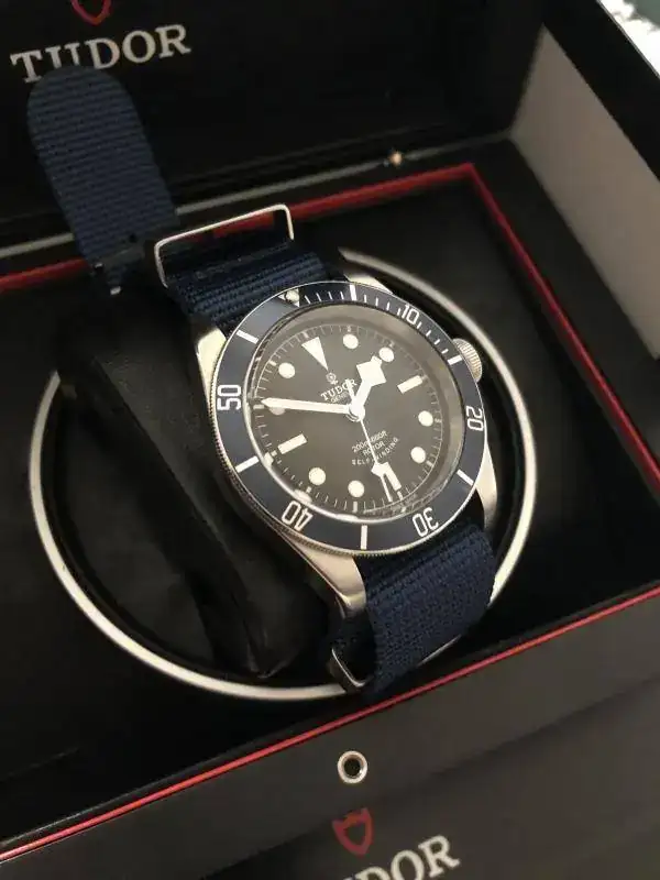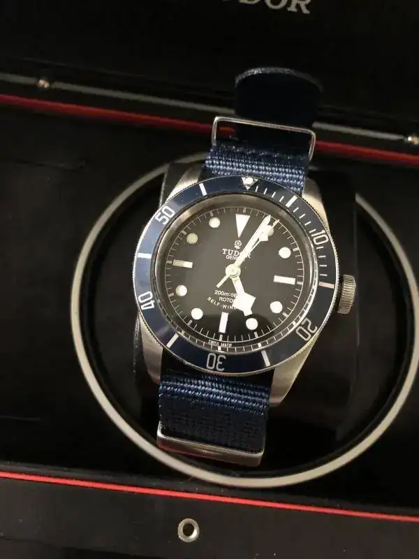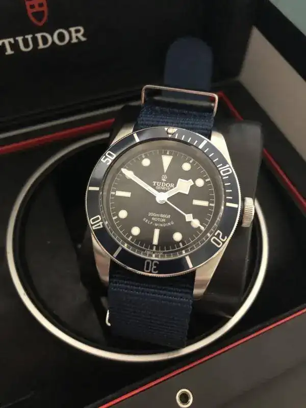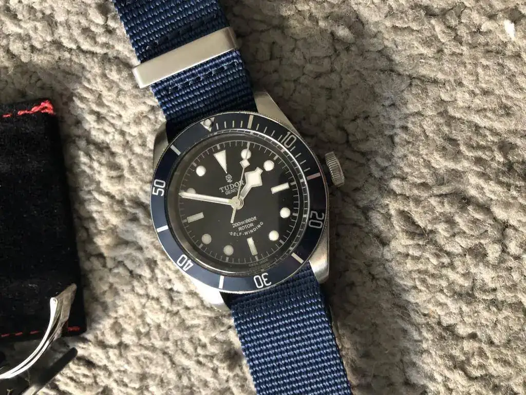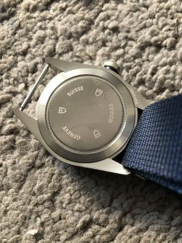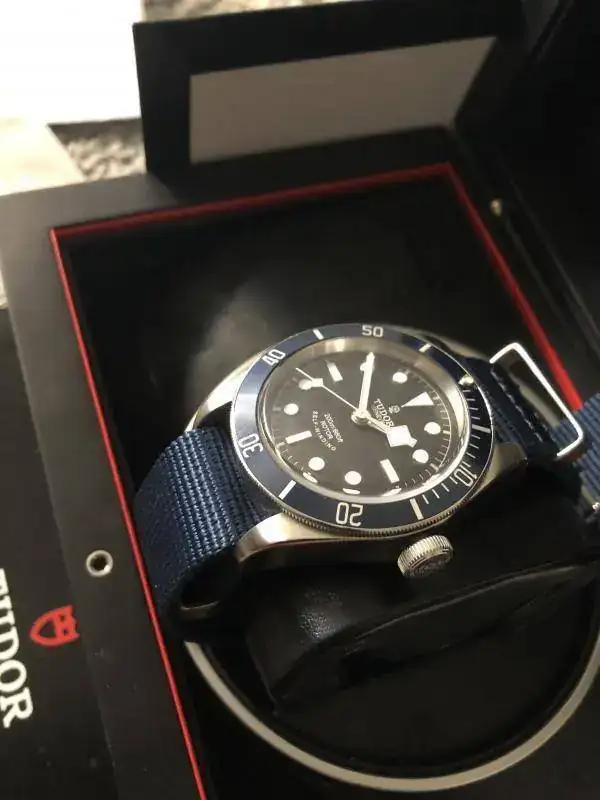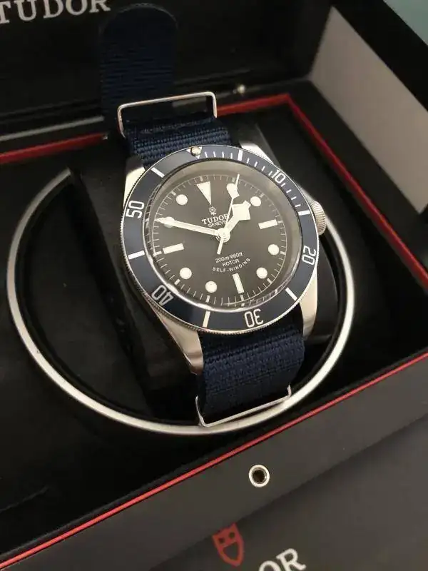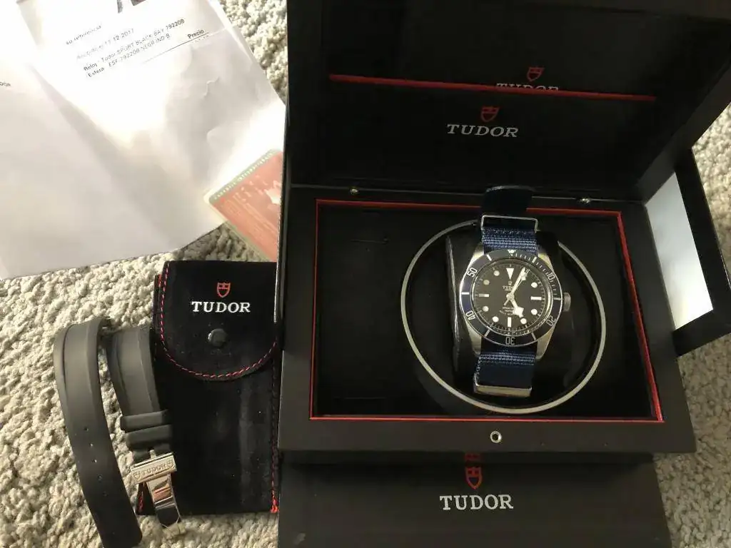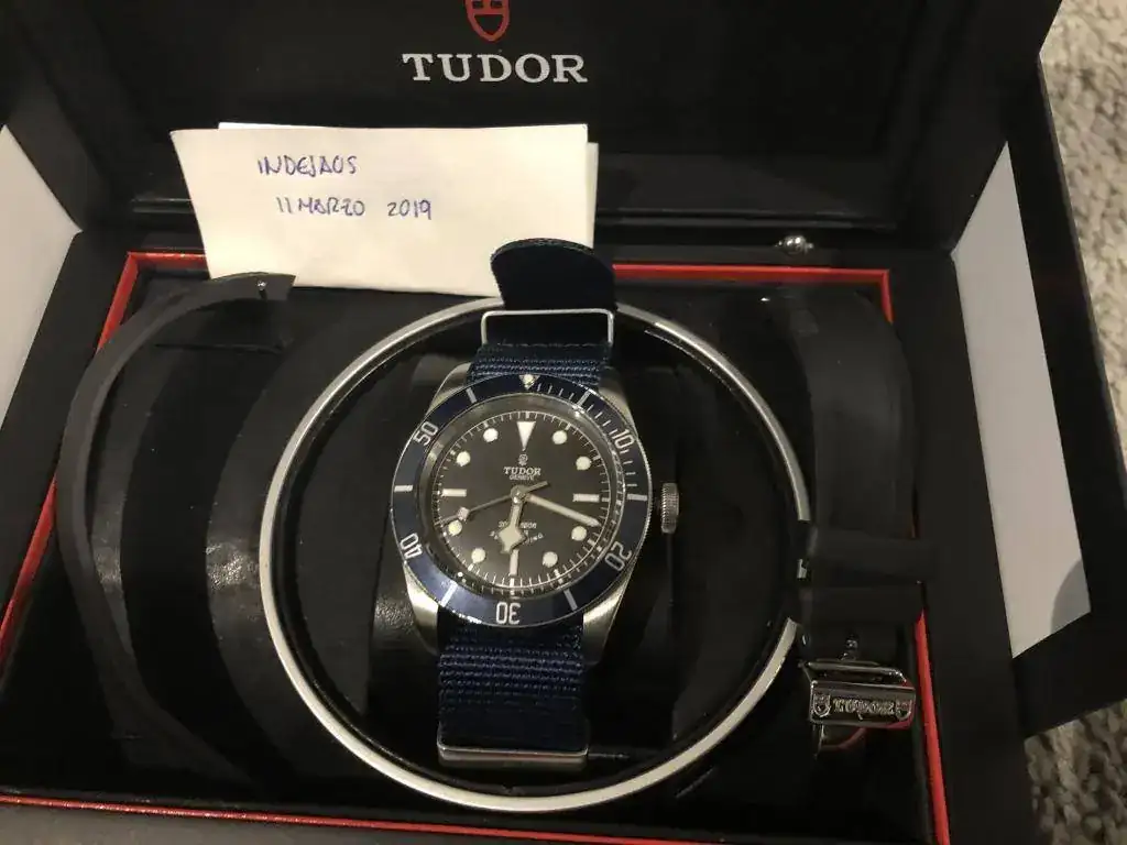 Brazalete: lleva un par de correas, una nato genérica azul, y un caucho tudor original con deployante de 21mm-16mm.