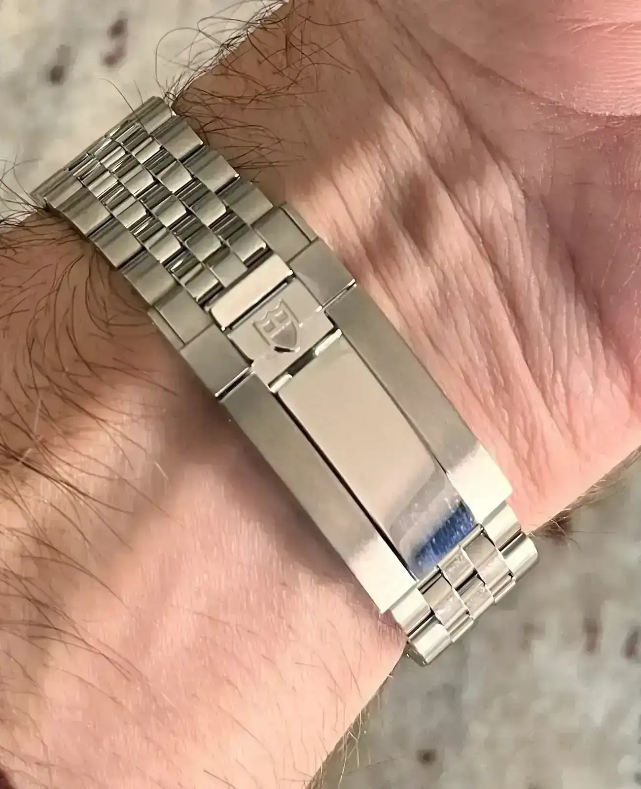El brazalete es espectacular: una vez ajustado se siente como seda. Los cinco eslabones, más cortos que los habituales, mejoran la articulación y el confort. El cierre incluye ajuste fino T-Fit con un acabado pulido que evocaría a los tope de gama de ciertas marcas como Grand Seiko.