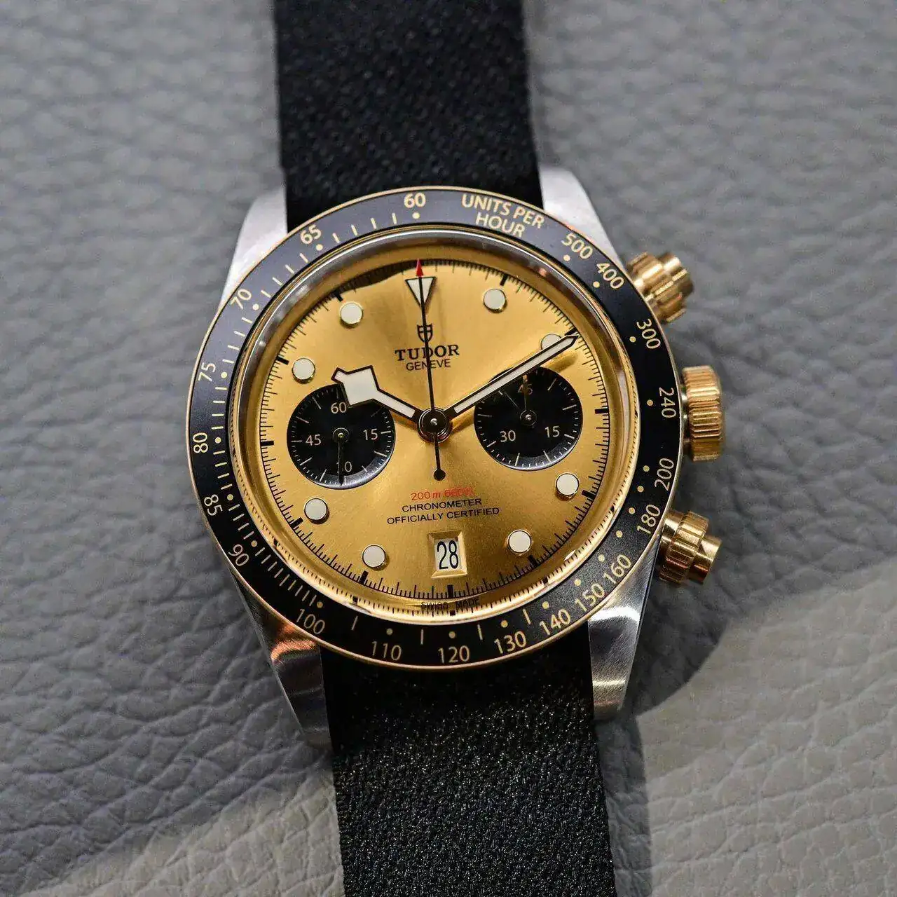 Y con la correa Bund marrón, la combinación es perfecta.Pues seguramente. Pero justamente a mi lo que más me gusta es la esfera dorada, me parece que le da un toque especial y es una alternativa a tanta esfera negra, azul y blanca. Por ejemplo ese color y con el efecto rayos de sol le queda también fenomenal en mi opinión al Chrono.