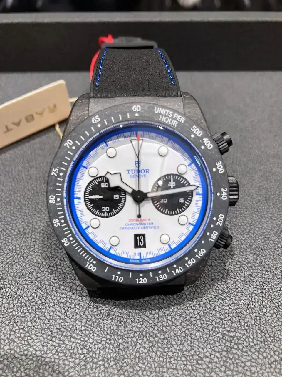 Esta versión se vincula al equipo de F1 Visa Cash App Racing Bulls, de la que toma los códigos de color, con un resultado estético ya digo que muy atractivo. La trasera, que no sé por qué no he fotografiado, también es de titanio con tratamiento PVD negro y luce orgullosamente la numeración XXX-2025, que es la cantidad a la que está limitada esta edición. Creo que el "Azul Tudor" va a dar que hablar...
