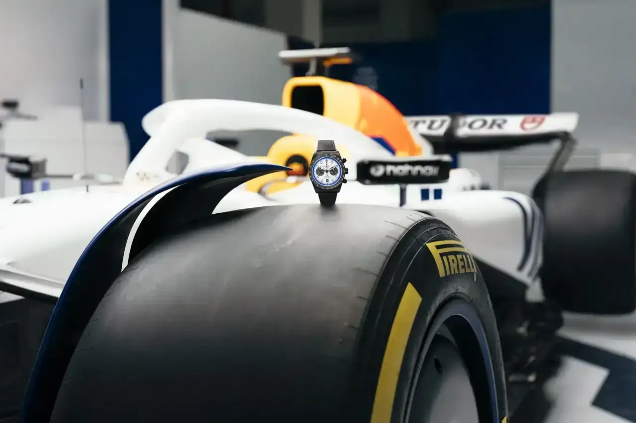 2. Esfera abombada «racing white» que presenta códigos estéticos del coche del Visa Cash App Racing Bulls Formula One Team de 2025, con subesferas que contrastan en fibra de carbono.
