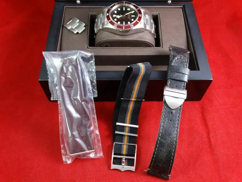 El reloj fue adquirido en 2017 en concesionario nacional. El reloj ha tenido un uso moderado y bien cuidado como se puede apreciar en su estado, el cual es excelente. Incluye un set supercompleto, formado por nato burdeos, nato negra stripe, correa de piel con deployante, tarjeta de garantía, manual, libro de garantía, tarjetero, caja y sobre-caja de cartón. En su interior un calibre manufactura a toda prueba.