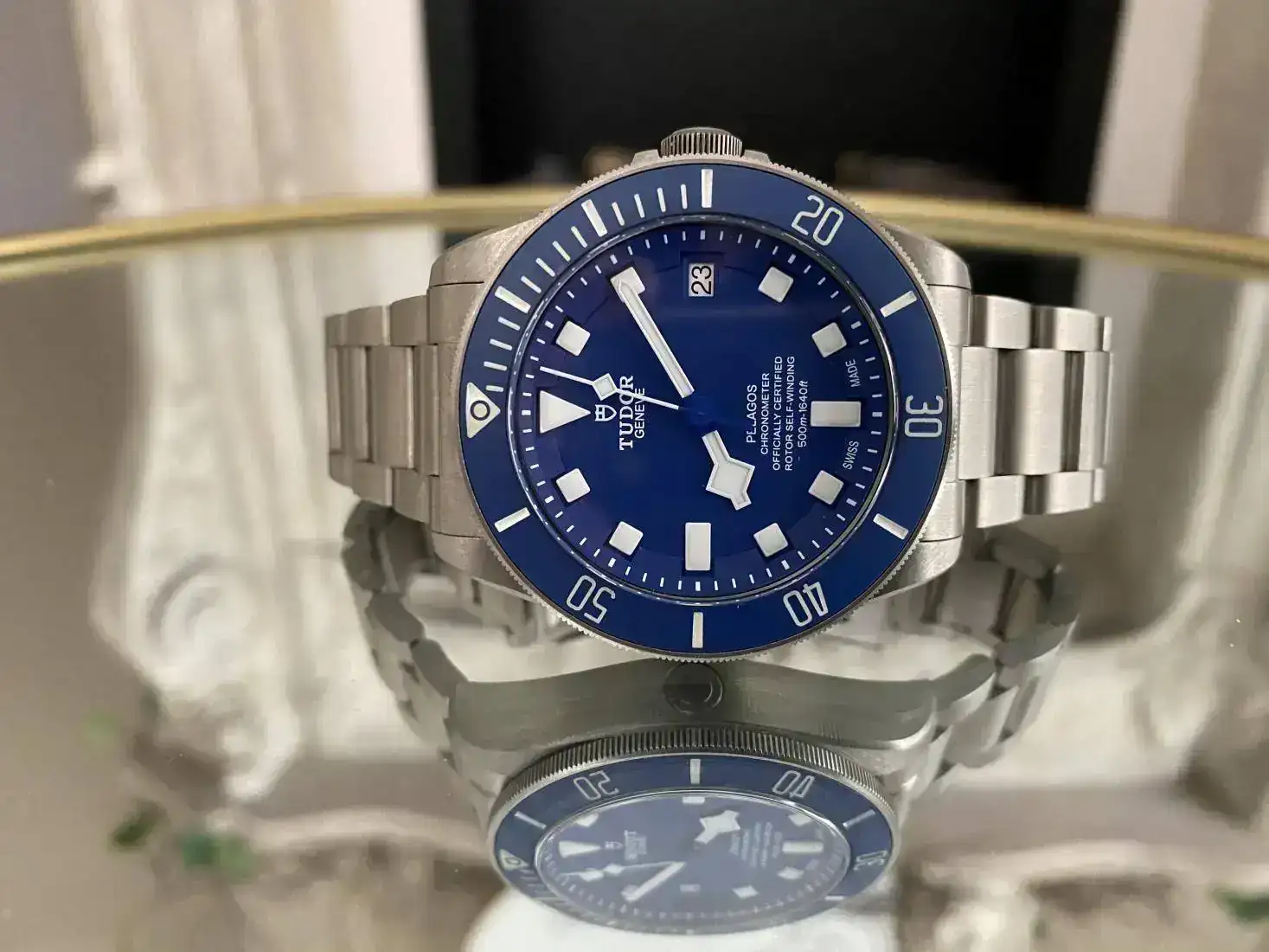 Tudor Pelagos: modelo de titanio (cons sus pros y contras), pero me gusta por sus con grandes acabados, con una estética de diver herramienta contundente pero sin dejar de ser "elegante"/"ponible" en el dia a dia con el tipo de vestimenta que llevo. Tiene un precio muy bueno para todo lo que ofrece (Titanio, manufactura, bisel cerámico, 5 años de garantía)
