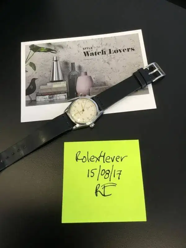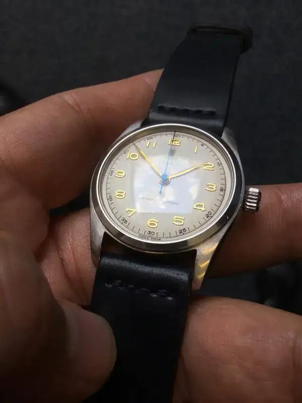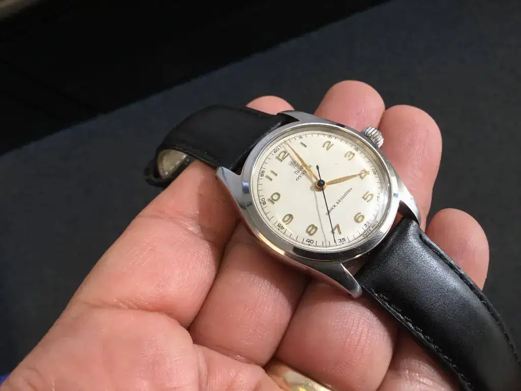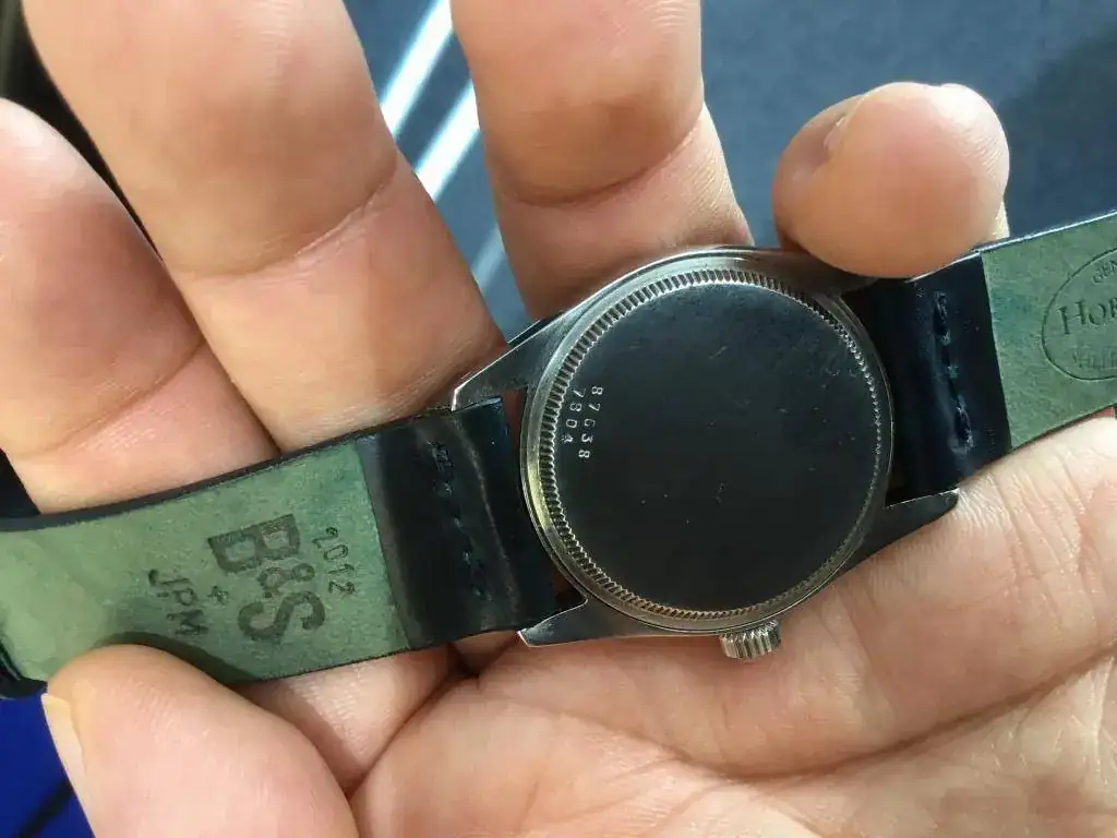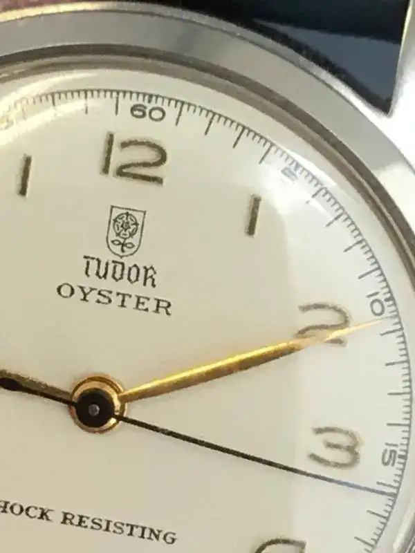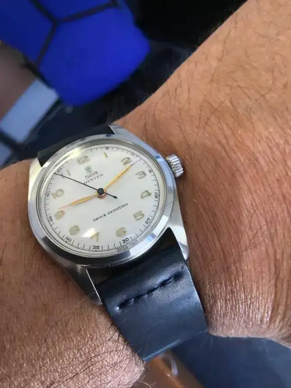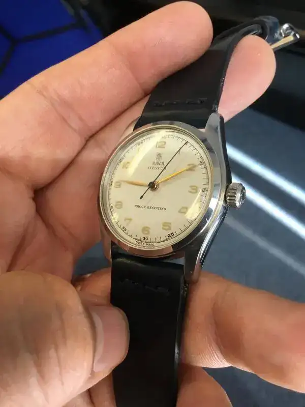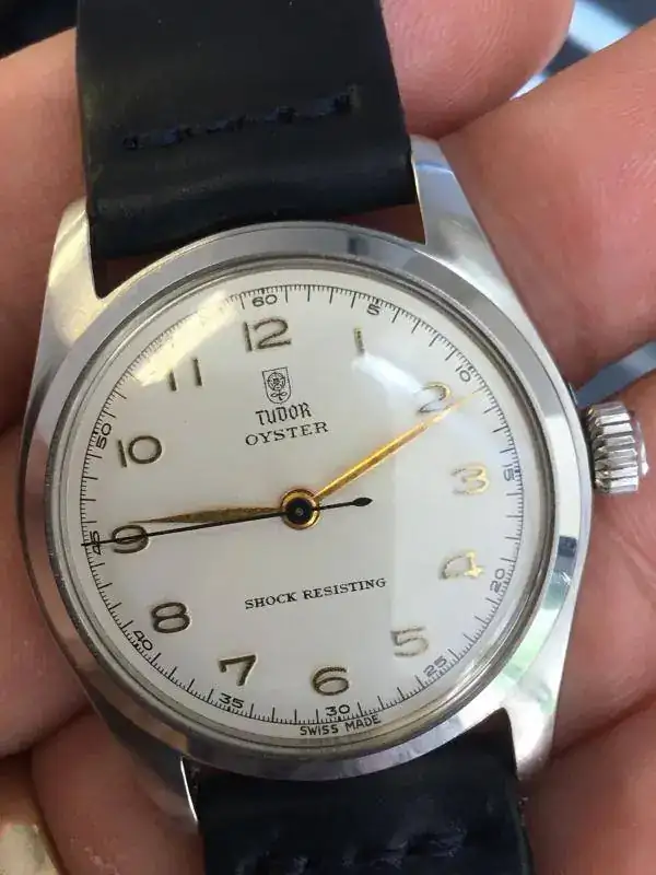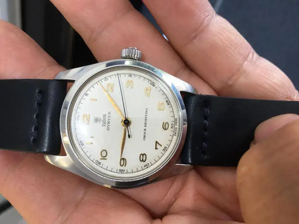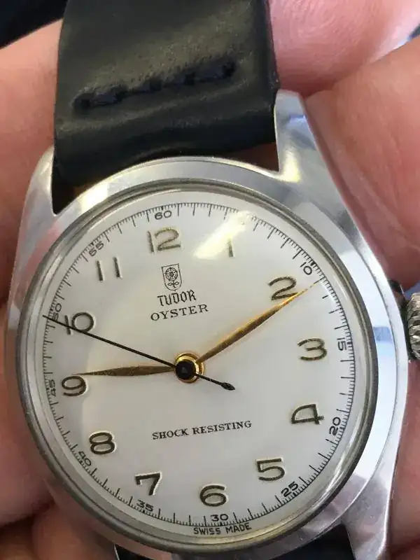 Saco a la venta este reloj que no he usado en los últimos 2 años. Se trata de un Tudor Oyster de remonte manual referencia 7804 de los años 40s. El reloj tiene una bella esfera blanca tipo "teléfono", con los 12 numeros arábigos acplicados en dorado, las agujas a juego salvo la segundera en un bello color azul, a juego con la correa Cordovan de B&S con algo de uso (la tenía puesta en un Air King que vendí, no ha tenido uso alguno en este reloj).