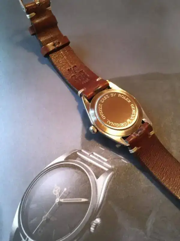 Tapa y caja de 34 mm largos de fabricación Rolex (de hecho la misma que los Air King antiguos, Explorer 5500 y Tudor Ranger, ahí es nada...), que con correa de cuero parece mucho más grande. Preciosa esfera impoluta en color negro-gris mate, tipo "confetti" (para mí lo mejor del reloj), que al sol es un espectáculo (no he podido reflejarlo en las fotos). Con letras en gris, y no en blanco como suele ser lo más común, que según la luz recuerda a los cotizados "gilt" de los Rolex Vintage...). Excelentes índices aplicados. Agujas inmaculadas.
