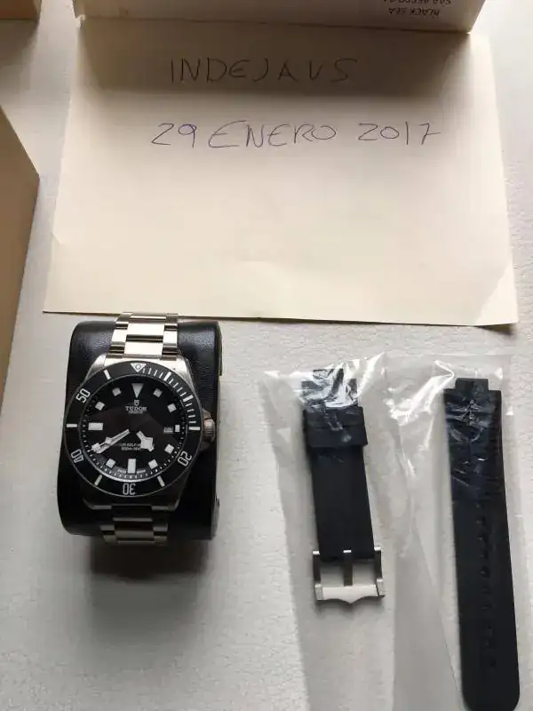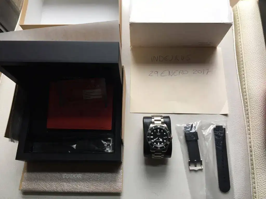 Está completo, con caja, papeles, garantía, tarjeta sellada....y 2 correas de buceo, aparte del armis
