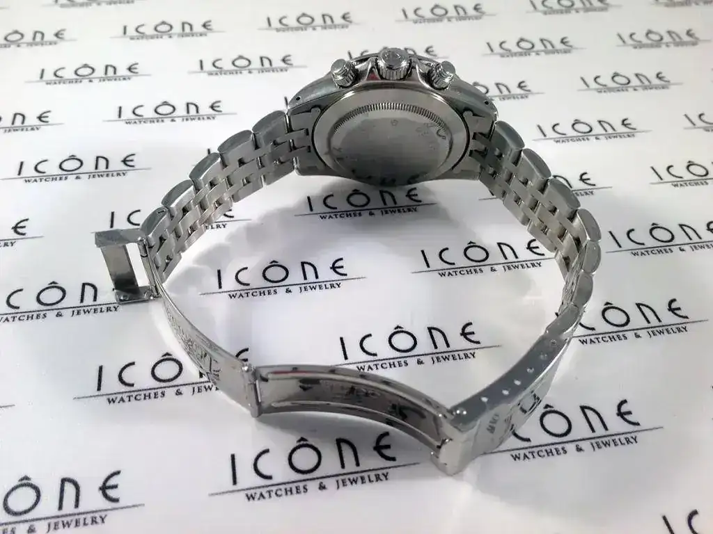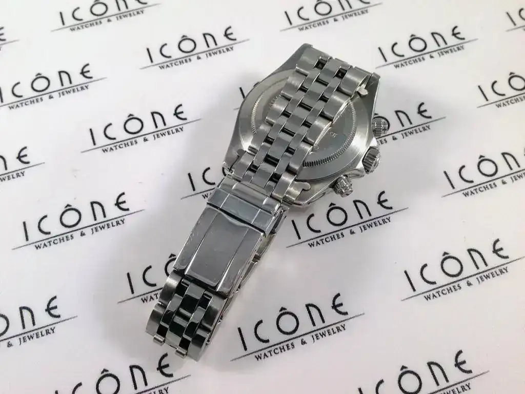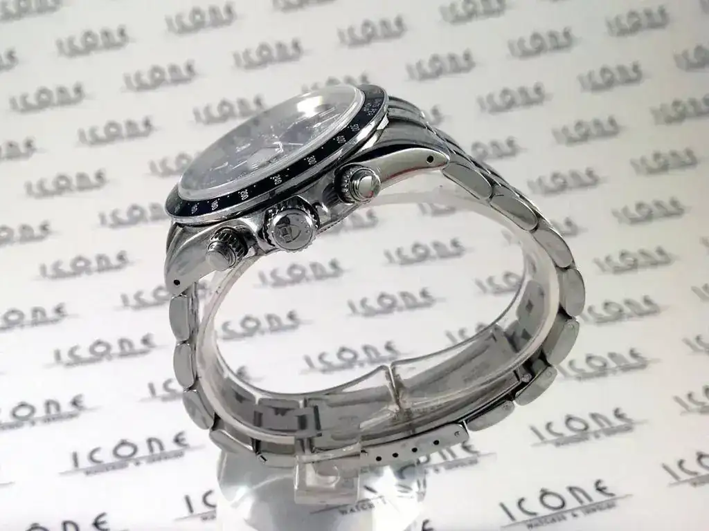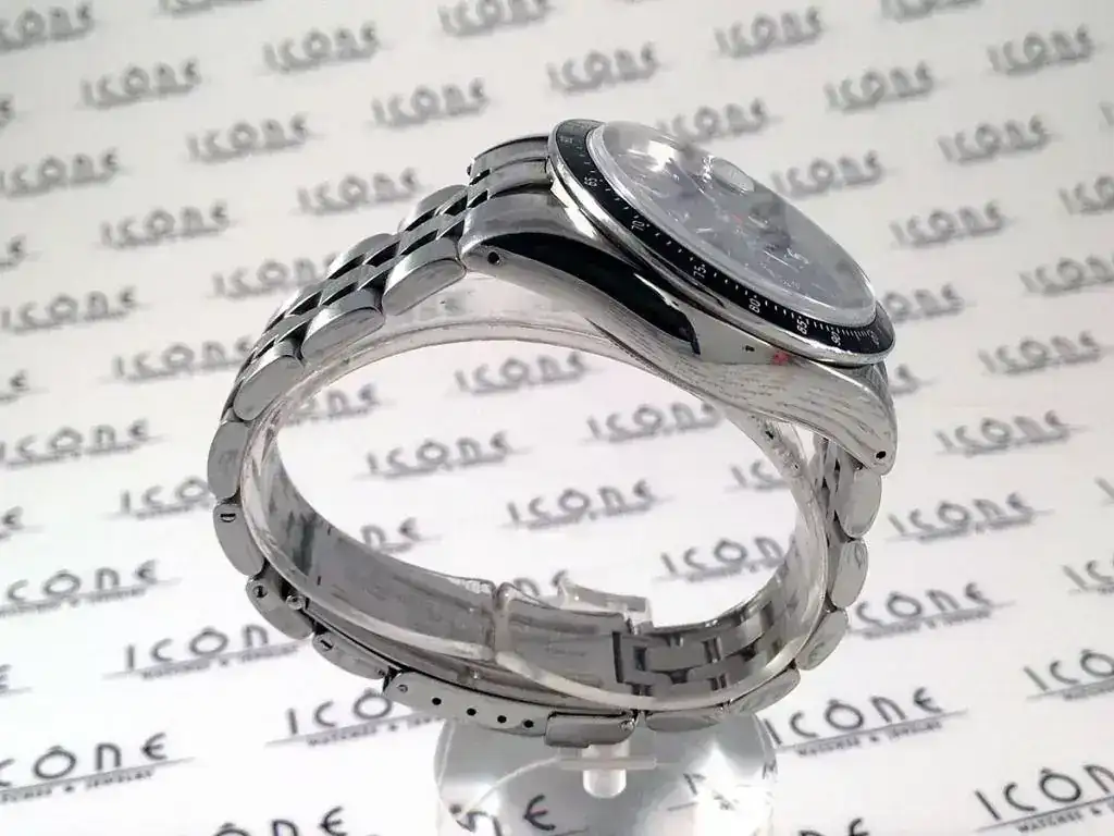 Sus características son: Reloj automático con caja de acero de 40 mm, armis de acero, cristal de Zafiro, calibre Valjoux 7750, sumergible a 100m.