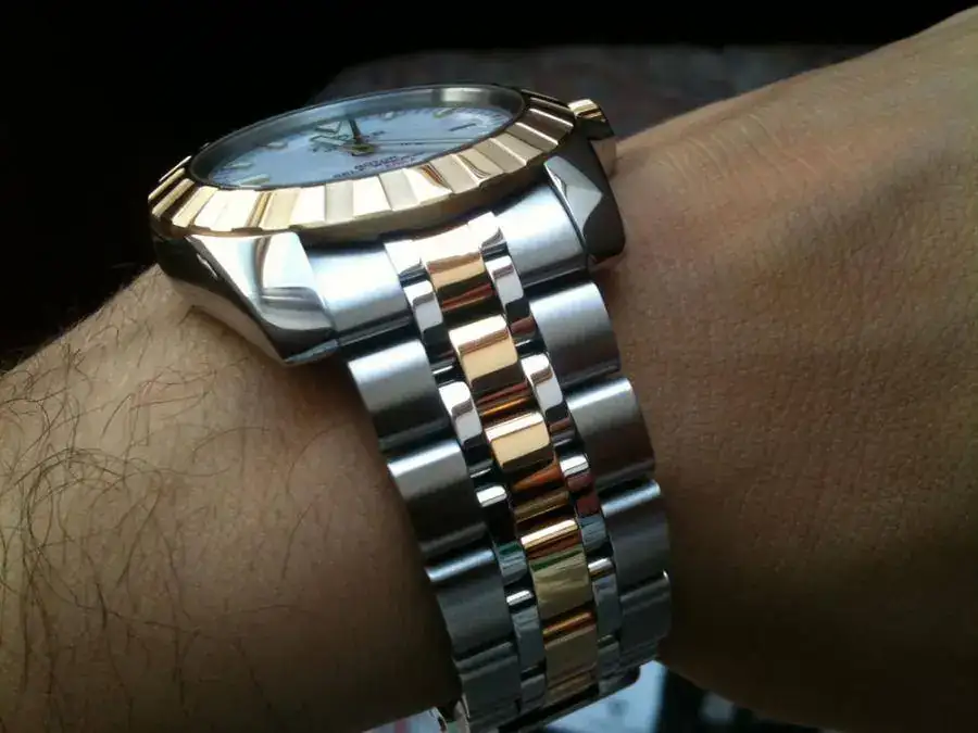 Caja: Acero 41mm (sin corona) con bisel de oro macizo, corona de oro a rosca. Hermeticidad 150m