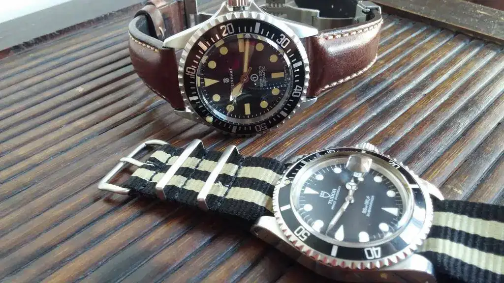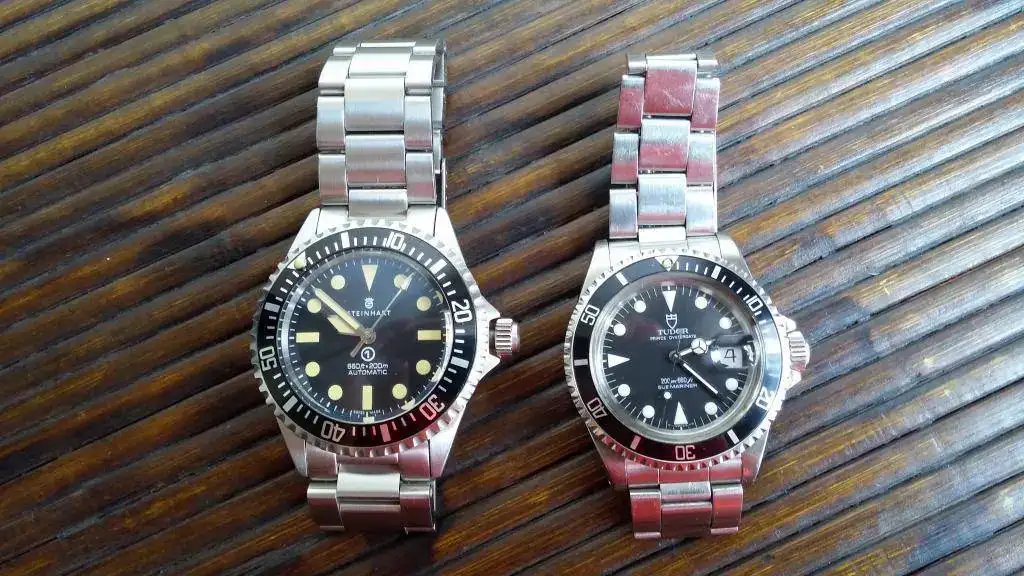 Los relojes puestos al lado uno del otro, sí que se nota que el Tudor es más pequeño (42mm el Steinhart, 40mm el Tudor), pero la diferencia no es muy notable.