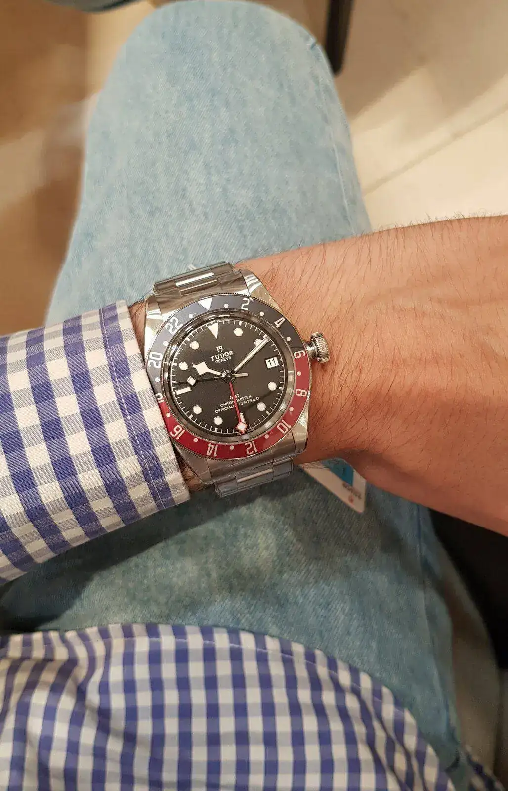 Tremendamente bonito en mano el GMT, no hay foto que haga justicia a ese tono de azul y rojo.