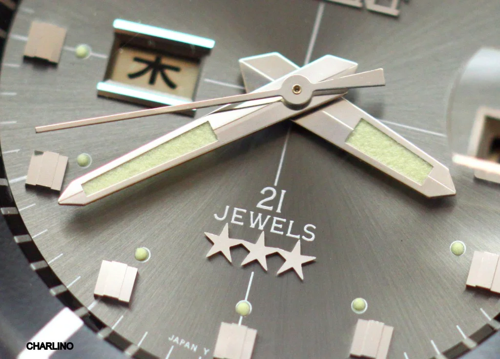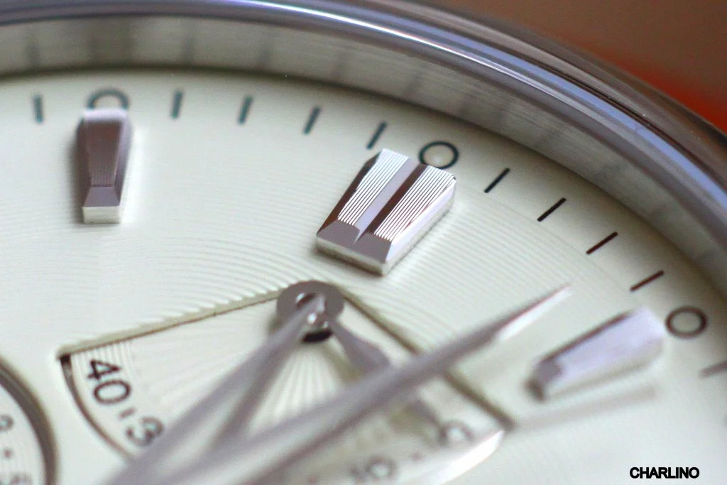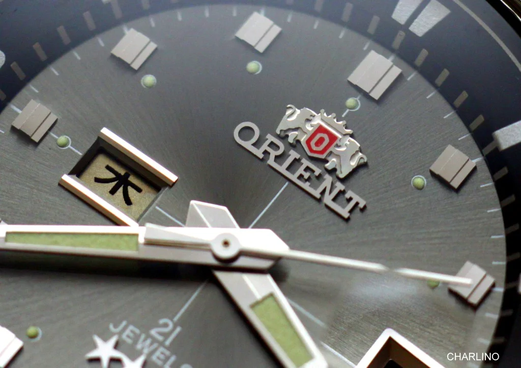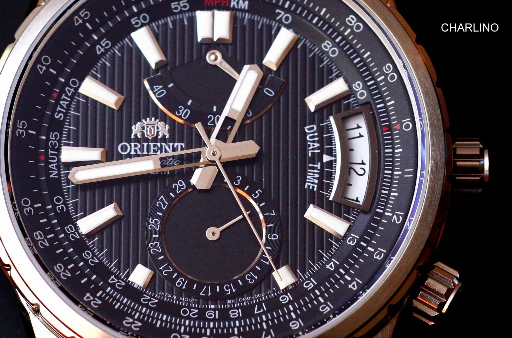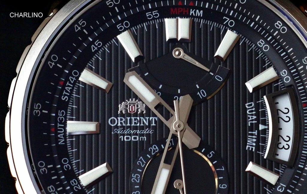 El Orient Voyager está a un nivel de acabados muy alto. Es un Orient de los 2010, de cuando todavía hacían algunos relojes tan buenos como los Orient Star sin ser Star. No solo por el calibre complicado y preciso o por un zafiro AR o un brazalete de tanta calidad como los de un Orient Star, sino por un nivel de acabados también similar. El Voyager tiene agujas semi esqueleto y de tres caras, porque están ampliamente biseladas por ambos lados, tiene un lumen espectacular y colocado sin la más mínima imperfección en cada aplique y aguja, perfectamente alineado en todos los sitios, e incluso en la agujita de la reserva de marcha; y pese a que gran cantidad de sus muchos índices e inscripciones están pintados sobre texturas y guilloché, todo está muy bien hecho, sin defectos. Defectos que sí he visto a veces en fotos de cerca de relojes de marcas famosas mucho más caras.