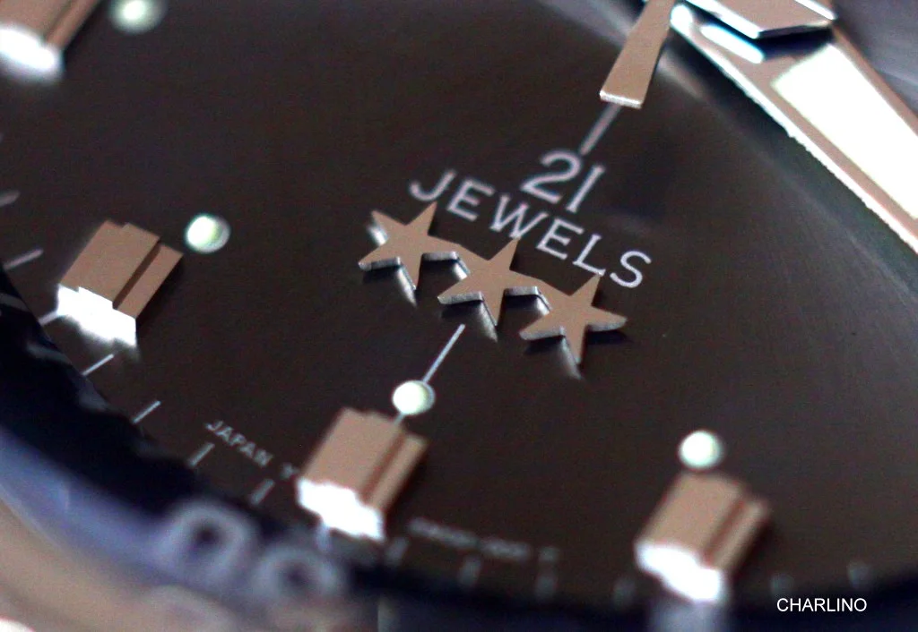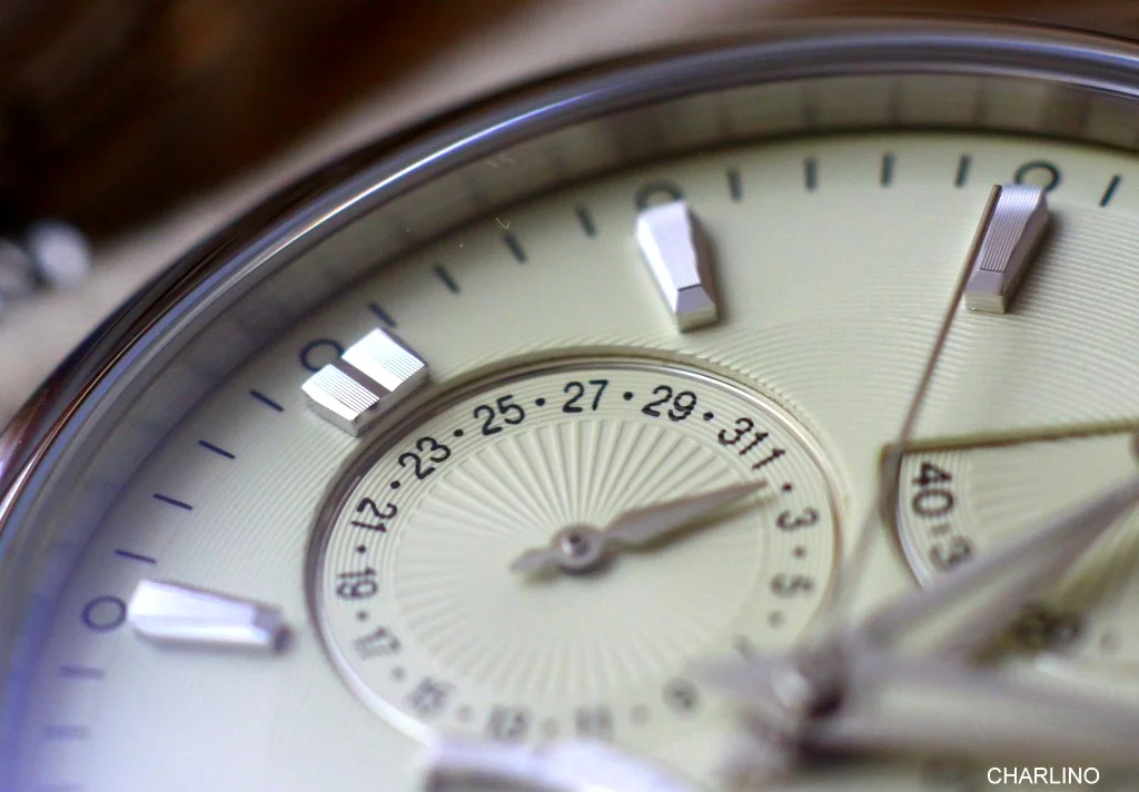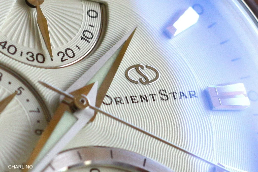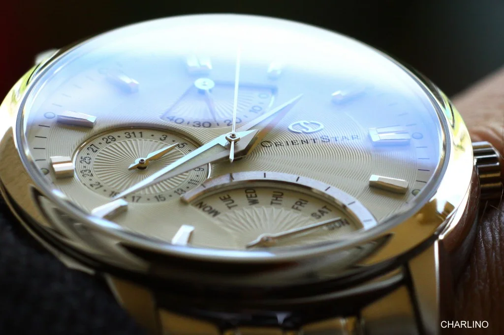 Y el Orient Star Retrógrado es una delicia de calidad y acabados. Tiene una esfera con varias capas, los bordes de las subesferas están perfectamente acabados a pesar de la dificultad del guilloché, tiene remates metálicos y apliques satinados y pulidos que dan mucha sensación de calidad, las agujas tienen dos caras, una pulida a espejo y la otra satinada, cinco tipos de guilloché, unos más finos y otros más gruesos, con diferentes dibujos, y con todos sus índices y numeritos perfectamente pintados sobre las texturas, los apliques de las horas son facetados, con biselados y acanalados, para producir bonitos brillos al mover el reloj, mejorando la legibilidad aunque no haya mucho contraste de color con la esfera y aumentando la sensación de calidad, de reloj muy elaborado.